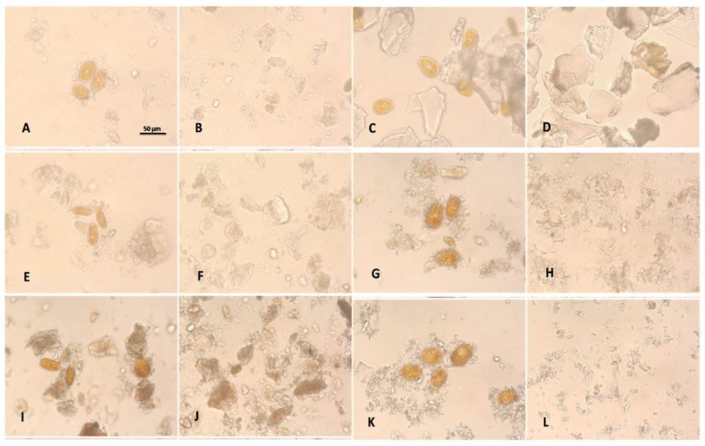 At the end of the experiment of Figure 3 most of the clay-water mixtures were removed. 10 mL of bottom samples of each water column were taken at the end of the flocculation assay. A small sample of 10 µL was taken from the bottom and was visualized with the microscope. Those samples were prepared at the moment of viewing the state of Prorocentrum lima cells after clay treatment (floc images in the Nikon Microscope Eclipse E400 (Nikon corporation, Tokyo, Japan)).