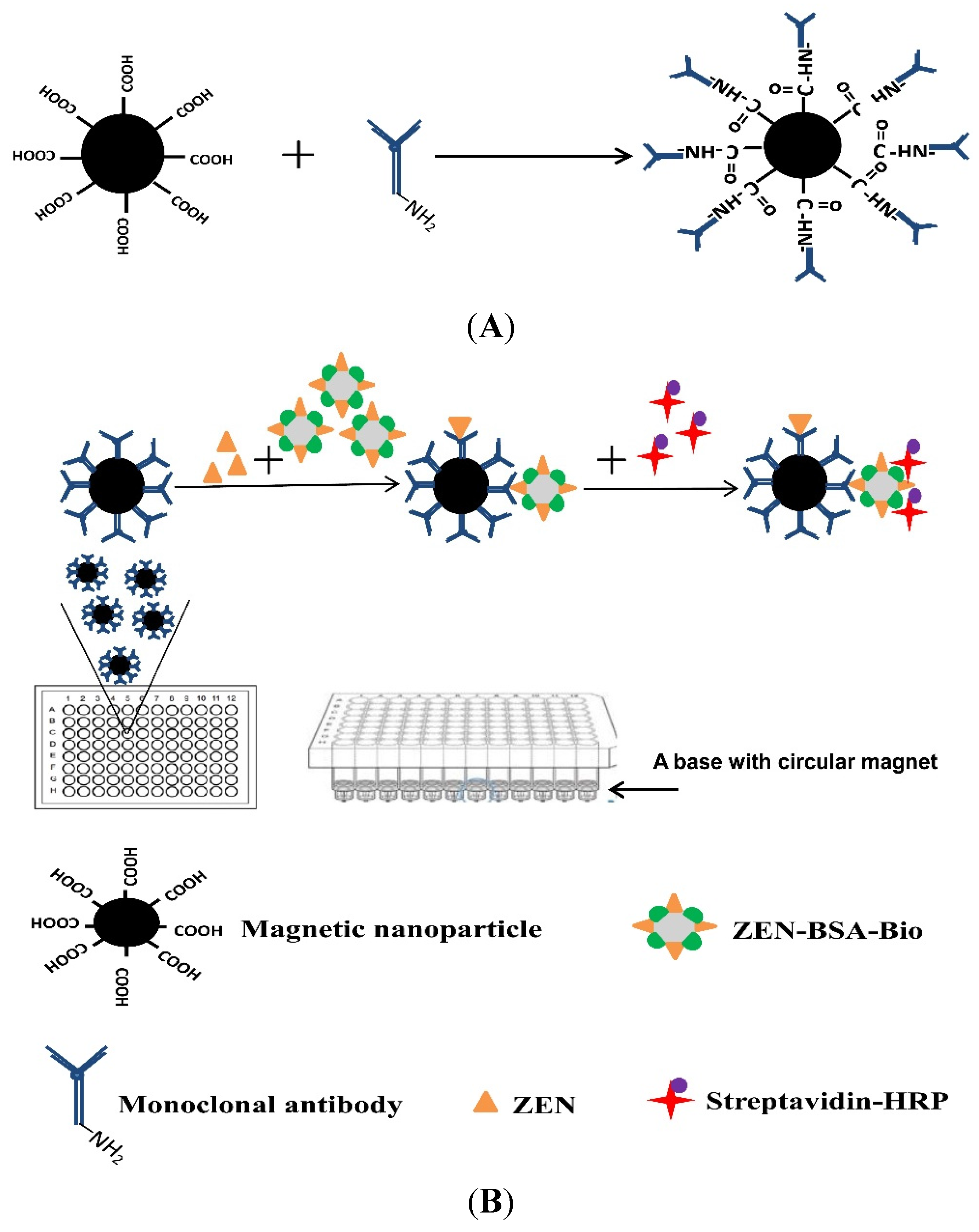 The immunomagetic nanoparticles were synthetized as described by the supplier (Invitrogen, Waltham, MA, USA; 14305D). The magnetic nanoparticle stock solution (100 μL) was transferred to a new Eppendorf tube which was then placed in a magnetic field to separate the nanoparticles from the storage solution. The nanoparticles were washed twice with coating buffer (25 mM MES buffer containing 0.05% Tween 20 (v/v), pH 5.0) (This buffer was prepared using the reagent mentioned in Section 3.1) before covalent coupling with the anti-ZEN antibody. EDC and NHS solutions (each at a concentration of 50 mg/mL) were prepared in coating buffer immediately before use. A volume of 50 μL each of EDC and NHS solutions were added to the washed magnetic nanoparticles and incubated with slow rotation at RT for 30 min. The tube containing the reaction mixtures was placed in a magnetic field to remove the supernatant and washed twice with coating buffer. The purified anti-ZEN monoclonal antibody (100 μg) in coating buffer (100 μL) was added to the activated nanoparticles and incubated for at least 30 min at RT, or 2 h at 4 °C with slow tilting rotation. The antibody-coated nanoparticles were washed with washing buffer (0.01 M PBS containing 0.02% Tween 20 (v/v), pH 7.4) (This buffer was prepared using the reagent mentioned in Section 3.1). In order to quench the non-reacted activated carboxylic acid groups, the coated nanoparticles were incubated with quenching buffer (50 mM Tris containing 0.05% Tween 20 [v/v], pH 7.4) (This buffer was prepared using the reagent mentioned in Section 3.1) for 15 min at RT with slow rotation. The antibody-coated magnetic nanoparticles (MNP-anti-ZEN) (Figure 1A) were then separated from the washing buffer and resuspended in storage buffer (washing buffer containing 0.5% BSA (v/v), pH 7.4) (This buffer was prepared using the reagent mentioned in Section 3.1). Conjugation was confirmed by indirect ELISA using biotinylated ZEN-BSA and Streptavidin-HRP. Coating efficiency was measured by analyzing the antibody concentration before and after coupling using the BCA (bicinchoninic acid) protein assay.