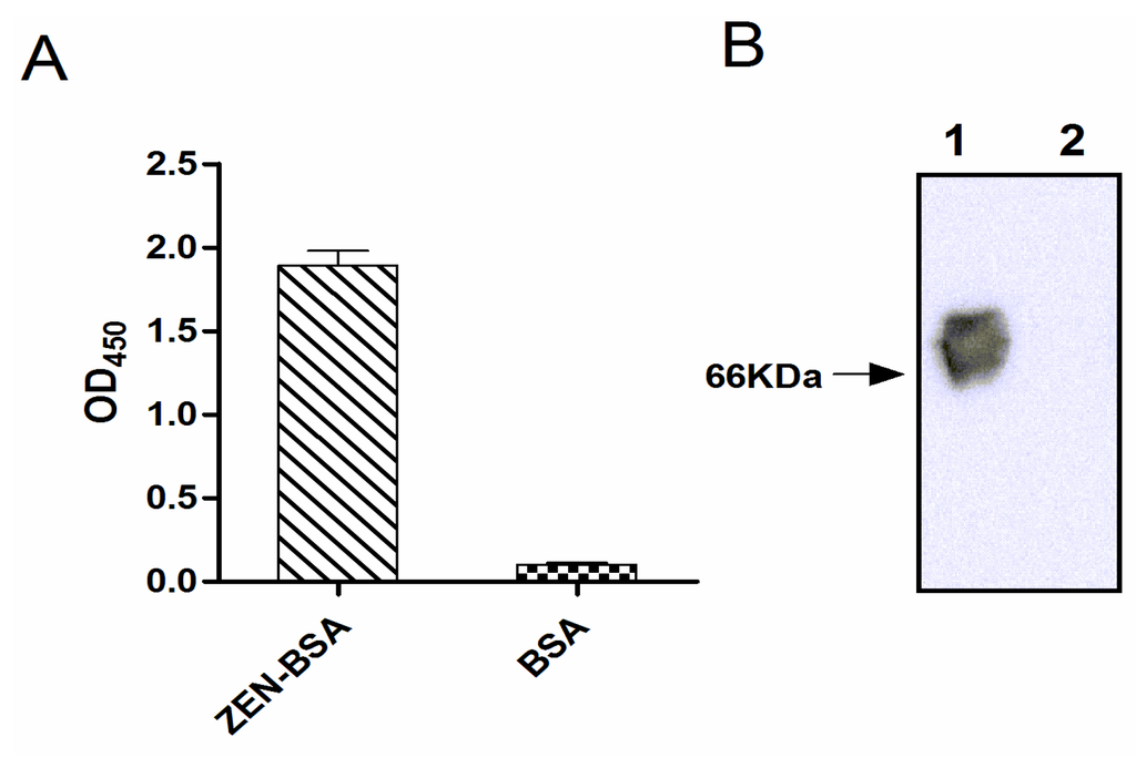 Identification of conjugation of zearalenone with bovine serum albumin (ZEN-BSA) by indirect ELISA (A) and Western blotting (B). The molecular weight of BSA is about 66 KDa. Lane 1: ZEN-BSA, Lane 2: BSA.
