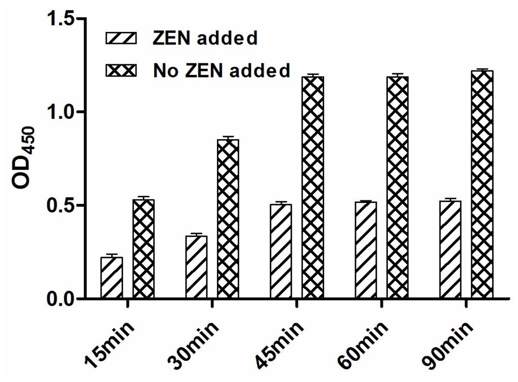 Determination of suitable incubation time by indirect ELISA with (+ZEN) or without (−ZEN) addition of zearalenone.