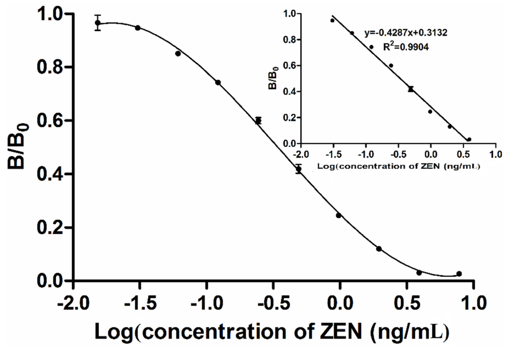 Zearalenone (ZEN), fumonisin B1 (FB1), aflatoxinB1 (AFB1), ochratoxin A (OTA), deoxynivalenol (DON), carboxymethoxylamine hemihydrochloride (CMO), bovine serum albumin (BSA), N,N′-dicyclohexylcarbodiimide (DCC), N-hydroxy-succinimide (NHS), 2-Morpholinoethanesulfonic acid (MES) and N,N-Dimethylformamide (DMF) were purchased from the Sigma Chemical Co. (St. Louis, MO, USA). ZEN analogues (α-zearalanol, α-zearalenol, β-zearalanol, β-zearalenol, and zearalanone) were purchased from UcallM Biotechnology Co. (Wuxi, Jiangsu, China). A hybridoma cell line secreting monoclonal antibodies against ZEN (mAb 2C9) was prepared in our laboratory. EZ-Link sulfo-NHS-LC-Biotinylation Kit (21435) was purchased from Thermo Fisher Scientific (Wyman Street, Waltham, MA, USA), Streptavidin-horseradish peroxidase (Streptavidin-HRP) was obtained from Anaspec (Fremont, CA, USA). Magnetic nanopaticles M-270 carboxylic acid (14305D) was obtained from Invitrogen (Carlsbad, CA, USA). Other reagents of analytical grade, including 3,3,5,5-tetramethylbenzidine (TMB, as ELISA substrate), were purchased from Sinopharm Chemical Reagent Co. Ltd. (Shanghai, China). Both the ZEN-free and naturally contaminated cereal and feed samples were provided by the Zhejiang Entry-Exit Inspection and Quarantine Bureau (Hangzhou, Zhejiang, China).