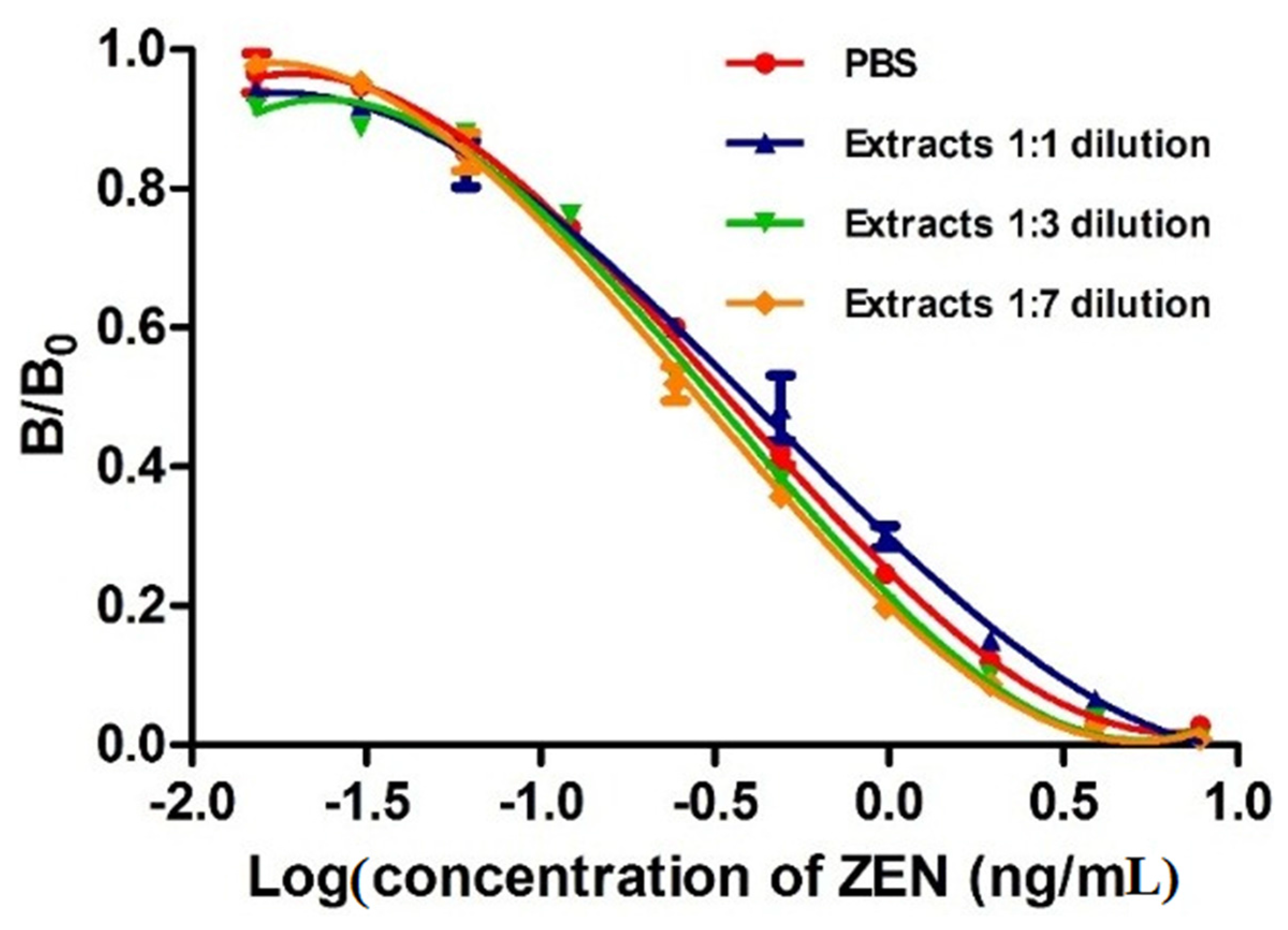 Methanol in the extracted solution buffer and the components in the sample extracts, including proteins and vitamins, are known to affect the immuno-reagents and immune-reactions [43,44]. In this study, matrix interference was determined by comparing a calibration curve prepared in PBS with those obtained in serial diluted ZEN-free corn sample extracts. Figure 6 shows that all dilutions of the extracts with PBS reducing the matrix interference. Because these curves were all superimposed, we suggest that 1:1 dilution is enough to minimize the matrix effect. Matrix interference was often excluded by substantial dilution of the sample prior to analysis according to previous studies [45,46]. However, higher dilution would cause proportional reduction of the assay sensitivity. Therefore, a 1:1 dilution was selected for recovery test and detection of ZEN in cereal and feed samples in this study.