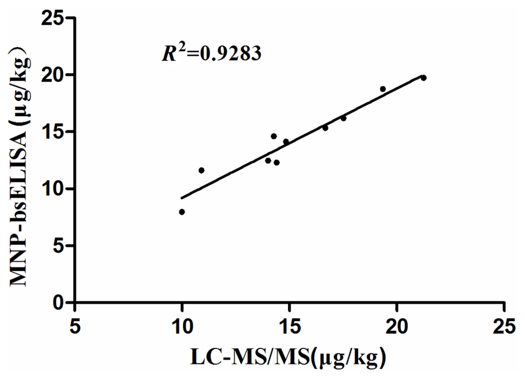 The natural samples were analyzed using both the MNP-bsELISA and LC-MS/MS. The results are shown in Table 3 (only positive samples are listed). Given that the detection limit of LC-MS/MS was 5 ug/kg, levels of ZEN below this could not be detected, but could be detected by MNP-bsELISA. Ten samples were subjected to quantitative analysis by both methods. The relationship between MNP-bsELISA and LC-MS/MS results for ZEN in cereal and feed samples was assessed by regression analysis, MNP-bsELISA = 0.395 + 0.9599LC-MS/MS (R2 = 0.9283), indicating a good agreement between the two methods (Figure 7). These results demonstrate that the developed MNP-bsELISA can be used for ZEN detection in cereal and feed samples.