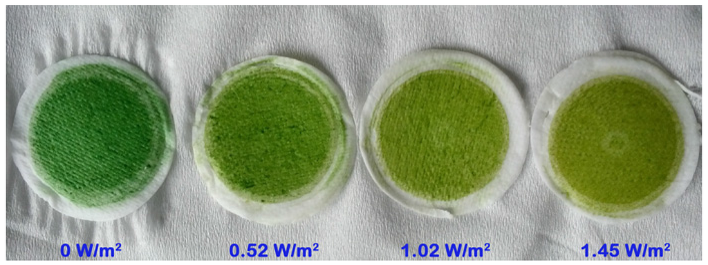 Exposure of M. aeruginosa to different intensities of UV-B radiation caused varying degrees of growth inhibition. The algal cells became brown in color following several days of exposure to UV-B radiation (Figure 1), and the cell growth rates showed negative dose-dependent correlations with UV-B radiation (Figure 2). M. aeruginosa cells exposed to 1.45 and 1.02 W/m2 of UV-B radiation showed growth rates of 0.09 and 0.12, respectively, after 10 days of culture. These rates were significantly lower compared to the growth rates of cells that had not been exposed to UV-B.