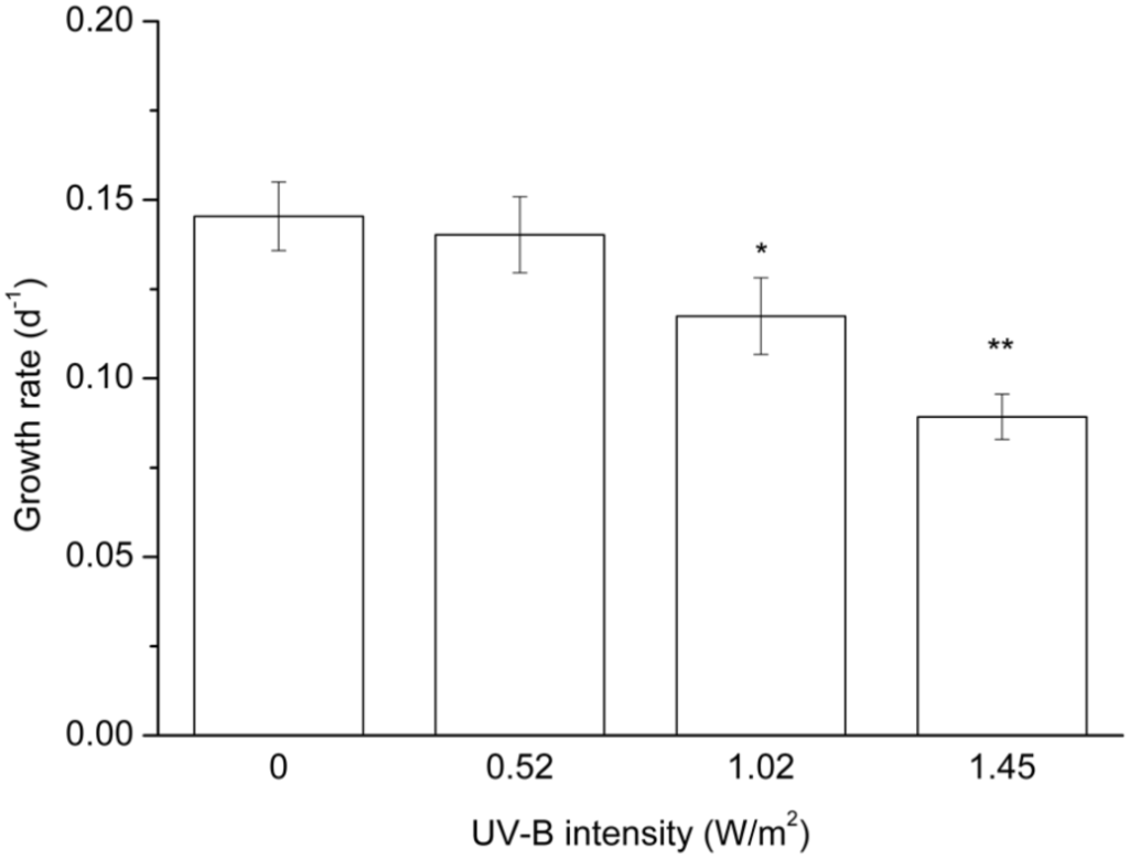Growth rates of toxic M. aeruginosa exposed to different intensities of UV-B radiation for 10 days. The data are the mean ± SD (n = 3). * Statistically-significant difference of p < 0.05 when compared to the control (0 W/m2); ** statistically-significant difference of p < 0.01.