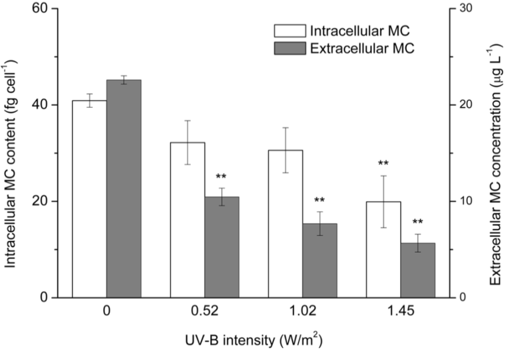Intracellular and extracellular microcystin (MC) concentrations of toxic M. aeruginosa exposed to different intensities of UV-B radiation for 10 days. The data are the mean ± SD (n = 3). ** Statistically-significant difference of p < 0.01 when compared to the control (0 W/m2).
