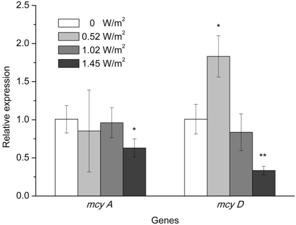 Relative expression level of mcy genes in toxic M. aeruginosa exposed to different intensities of UV-B radiation for 10 days. The data are the mean ± SD (n = 3). * Statistically-significant difference of p < 0.05 when compared to the control (0 W/m2); ** statistically-significant difference of p < 0.01.