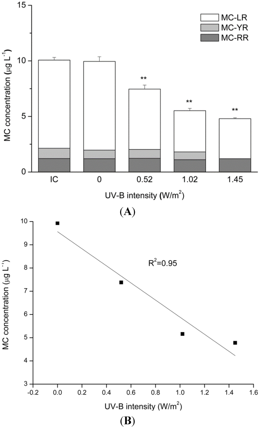 (A) Concentrations of three MC variants and total MCs under different intensities of UV-B radiation for 24 h. IC: initial concentration treatments and control (0 W/m2) before the experiment. The data are the mean ± SD (n = 3). ** Statistically-significant difference of p < 0.01 when compared to the initial concentration. (B) Linear relationship of UV-B radiation intensity and MC concentration.
