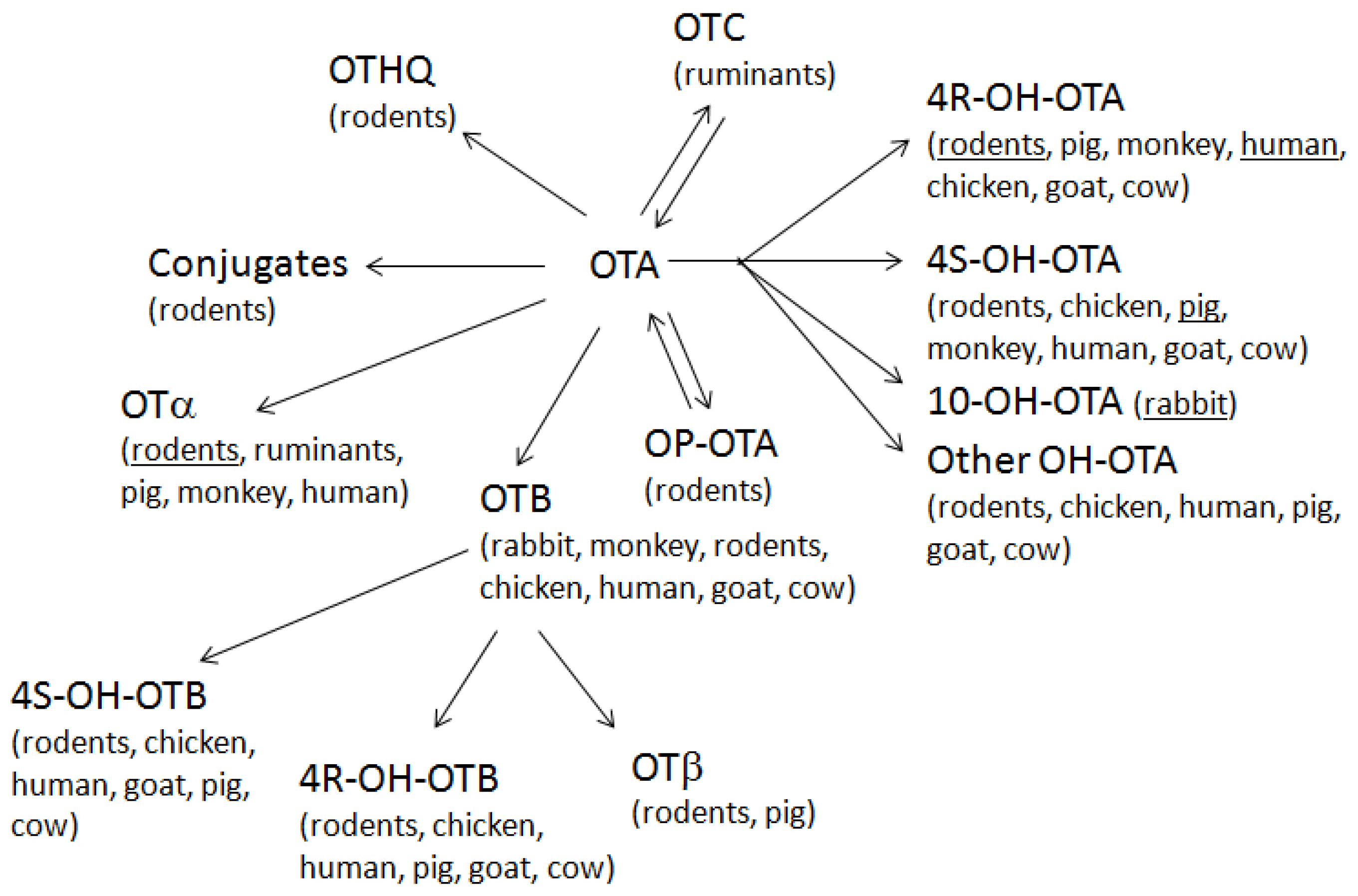 Overview of ochratoxin A (OTA) metabolites in animals and humans. Ochratoxins are differentially metabolised in various animals and humans depending on the metabolising enzymes present in liver, kidneys and/or gut. OTA, ochratoxin A; OTB, ochratoxin B; OTC, ochratoxin C; OTα, ochratoxin α; OTβ, ochratoxin β, OTHQ, OT hydroquinone; 4R-OH-OTB, 4R-hydroxyochratoxin B; OP-OTA, lactone-opened OTA; 10-OH-OTA, 10-hydroxyochratoxin A; 4R-OH-OTA, 4R-hydroxyochratoxin A; 4S-OH-OTA, 4S-hydroxyochratoxin A; 4S-OH-OTB, 4S-hydroxyochratoxin B. The respective metabolite is the main metabolite in the underlined taxa (for rodents, data of different authors is contradictory). Genera in brackets represent those where the metabolite has been detected, although it may be present in other animals or humans as well. Summarised from [52,53,92].