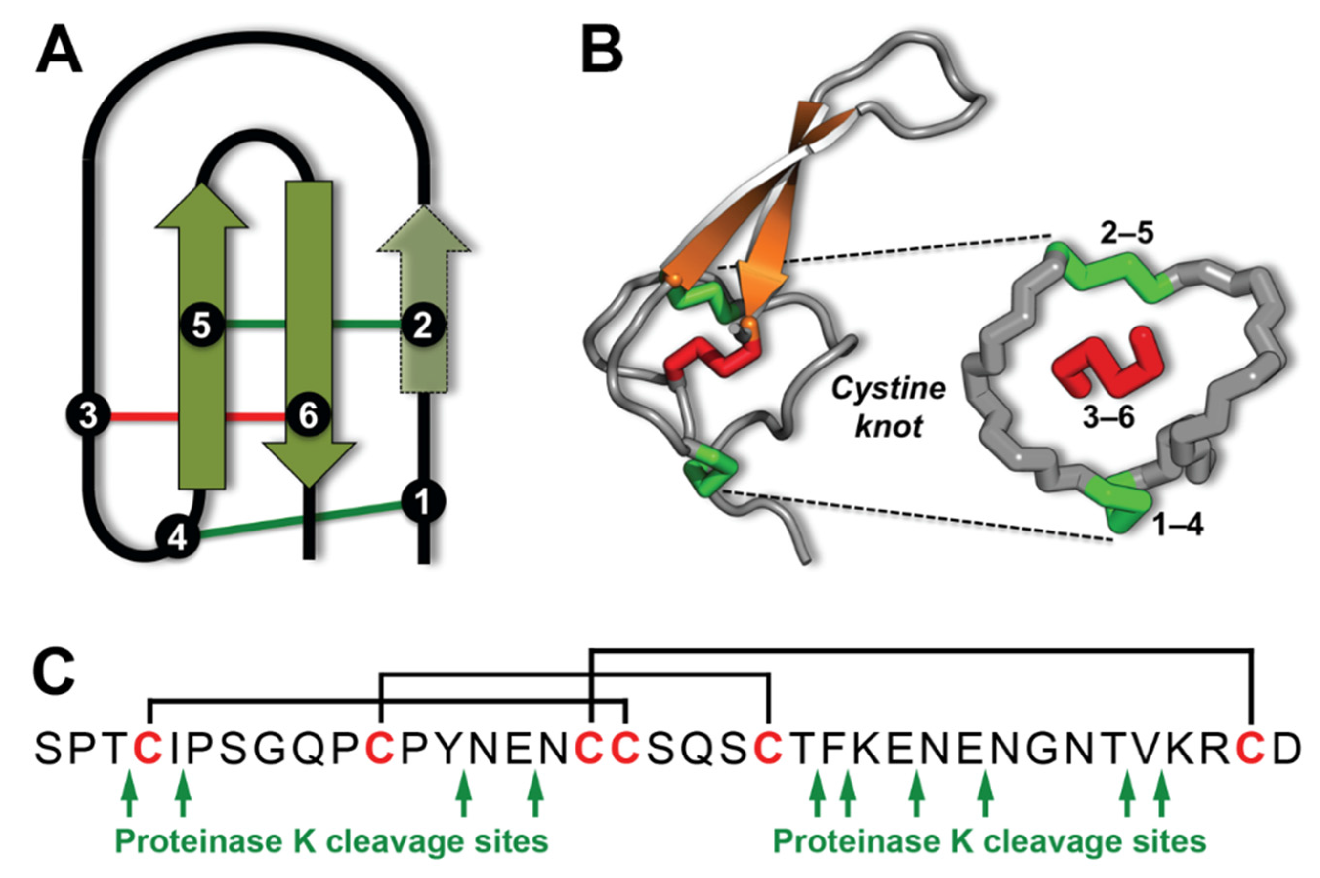 Inhibitor cystine knot of the spider-venom peptide ω-hexatoxin-Hv1a. (A) Schematic of the ICK motif, which comprises an antiparallel β sheet stabilised by a cystine knot [1]. β strands are shown in green and the six cysteine residues that form the cystine knot are labeled 1–6. In spider toxins, the β sheet typically comprises only the two β strands housing Cys5 and Cys6, although a third N-terminal strand encompassing Cys2 is sometimes present [3]. The two “outer” disulfide bonds are shown in green and the “inner” disulfide bridge is red. (B) Schematic of the three-dimensional structure of the 37-residue spider-venom peptide Hv1a (PDB 1AXH) [5] highlighting the ICK motif. The cystine knot comprises a ring formed by two disulfides (Cys1–Cys4 and Cys2–Cys5, green) and the intervening sections of polypeptide backbone (gray), with a third disulfide (Cys3–Cys6, red) piercing the ring to create a pseudo-knot. The hydrophobic core of the toxin consists primarily of the two central disulfide bridges connected to the β strands. (C) Primary structure of Hv1a showing the location of the three disulfide bonds and the 10 proteinase K cleavage sites predicted by PeptideCutter [6].