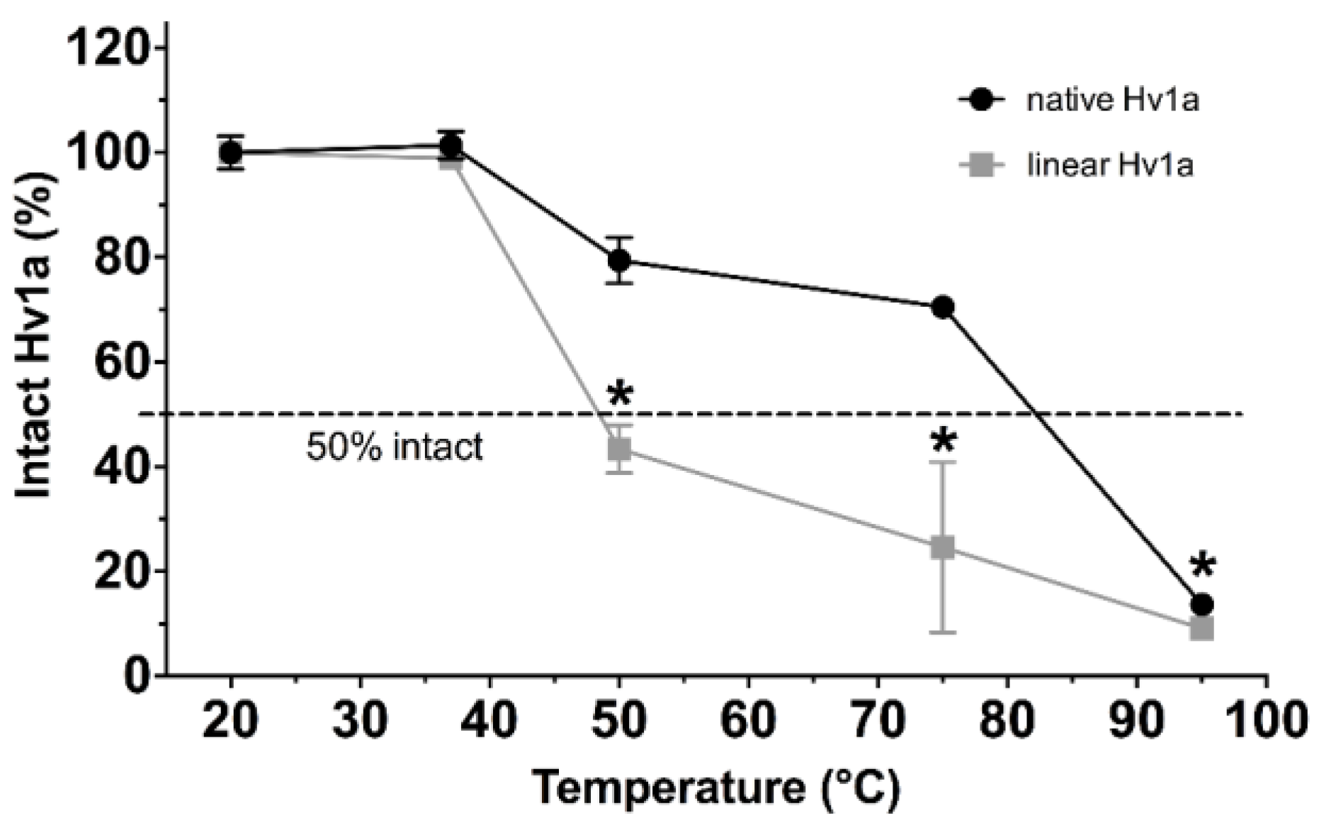 Thermal stability of Hv1a. Fraction of intact native Hv1a (black circles) and linear Hv1a (grey squares), relative to the corresponding 20 °C samples, after incubation at the indicated temperatures for 24 h. The dashed line indicates that the Tm under these conditions is ~48 °C and ~83 °C for linear and native Hv1a, respectively. Data are mean ± standard deviation (SD). In this and subsequent figures, asterisks indicate statistically significant differences between native and linear Hv1a (p < 0.05).