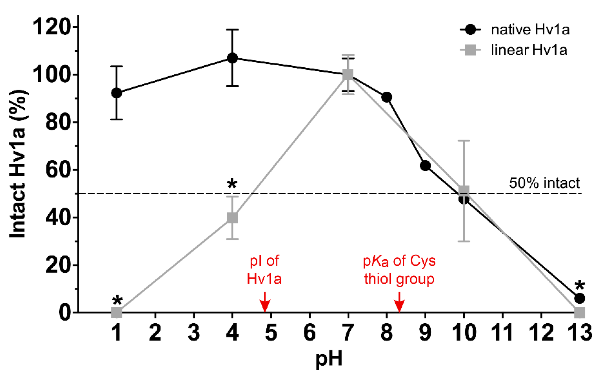 pH stability of Hv1a. Fraction of intact native Hv1a (black circles) and linear Hv1a (grey squares), relative to the corresponding pH 7 samples, following incubation for 24 h at the indicated pH. Dashed line corresponds to 50% intact toxin. The pI of Hv1a and the pKa of free cysteine thiol groups are indicated by the arrows. Data are mean ± SD.