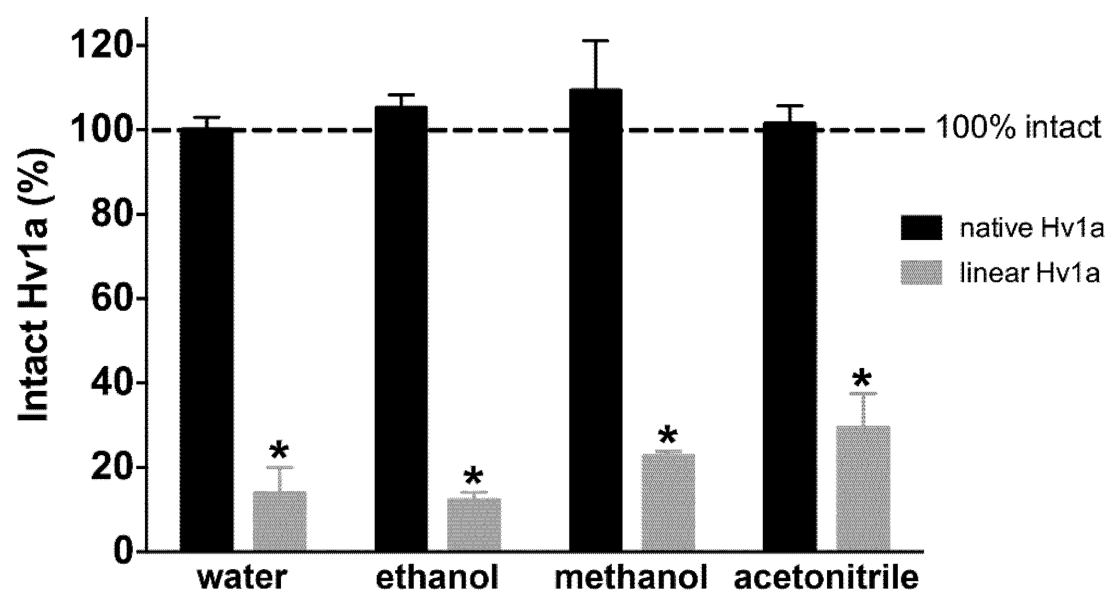 Stability of Hv1a in various solvents. Fraction of intact native Hv1a (black columns) and linear Hv1a (grey columns) after incubation for seven days in water and organic solvents. Toxin amounts were quantified relative to a control sample incubated for one day in water. Dashed line indicates 100% intact toxin. Data are mean ± SD.