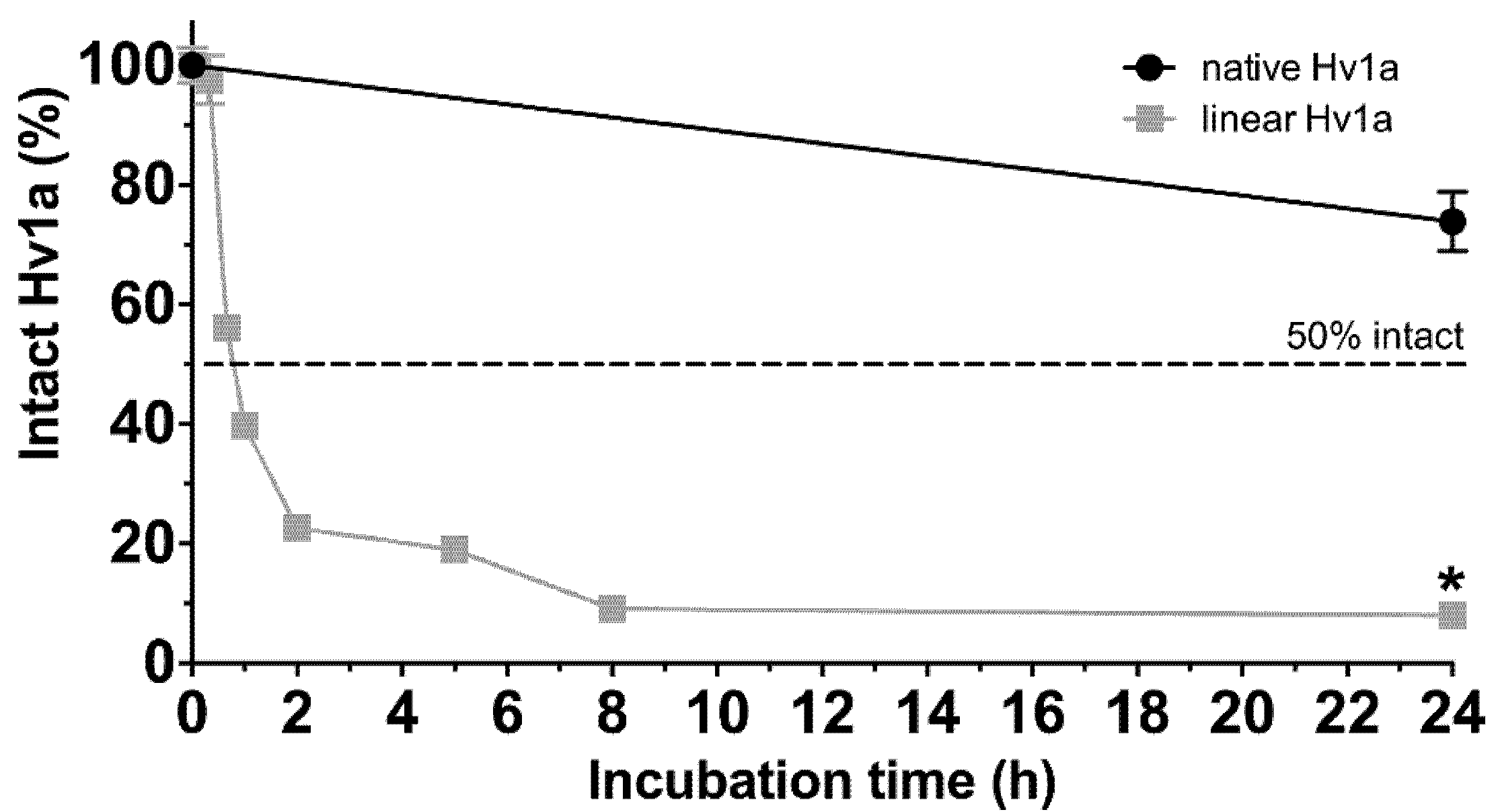 Proteolytic stability of Hv1a. Fraction of intact native Hv1a (black circles) and linear Hv1a (grey squares) after incubation with proteinase K (1:200 molar ratio) at pH 7.5 and 37 °C for up to 24 h. The values for native Hv1a were quantified relative to a sample of native Hv1a incubated for 24 h under the same conditions without proteinase K. Values for linear Hv1a were quantified relative to a sample of linear Hv1a at pH 7.5 incubated for 0 h without proteinase K. The dashed line indicates 50% intact toxin. Data are mean ± SD.