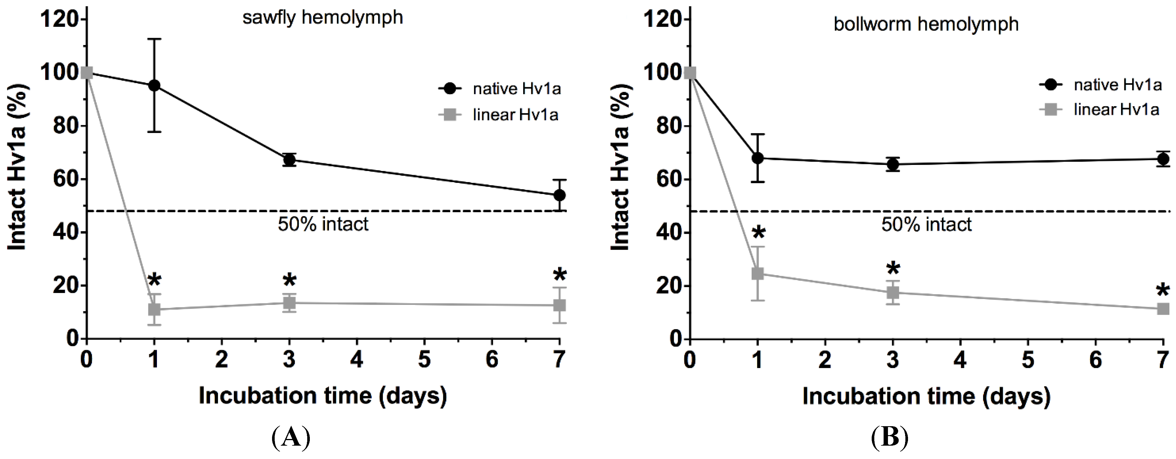 Stability of Hv1a in insect hemolymph. Fraction of intact native Hv1a (black circles) and linear Hv1a (grey squares) after incubation in (A) sawfly hemolymph and (B) bollworm hemolymph for up to seven days at ambient temperature (~20 °C). Native and linear Hv1a were quantified relative to control samples that were incubated in water for one day. The dashed line indicates 50% intact toxin. Data are mean ± SD.