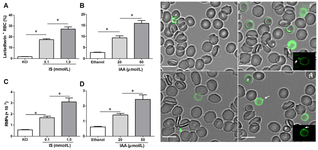 To visually identify PS on the outer membrane of RBCs and RMPs generation, RBCs were incubated with Alexa Fluor 488-lactadherin and imaged on a confocal microscopy. As shown in Figure 1F,H, partly RBCs exhibited volume reduction from normal discocytic shapes and changed into spherocytes with strong green fluorescence stained by lactadherin on the outer membrane and accompanying vesiculation formation. IS or IAA treatment induced typical MPs generation (the arrows indicate RMPs). Only very little staining by fluorescence-labeled lactadherin could be detected on control RBC (Figure 1E,G), which is in agreement with the findings presented in the flow cytometry measurements.
