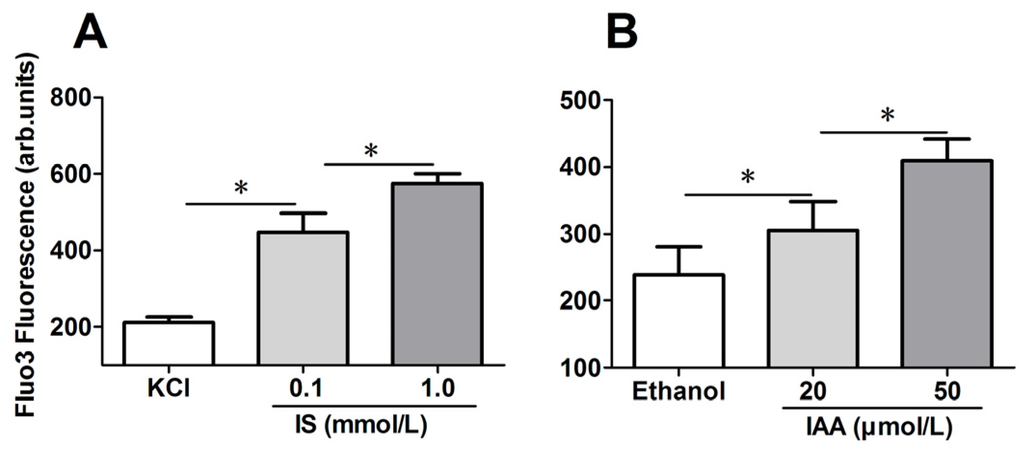 Figure 2. Role of uremic solution on erythrocyte cytosolic Ca2+ concentration. Following exposure for 24 h to the different indicated concentration of indolic uremic solutes, erythrocytes were washed in Ringer solution and then loaded with Fluo 3/AM. Ca2+ dependent fluorescence intensity was measured with flow cytometry. The Fluo-3 mean fluorescence intensity (MFI) (arbitrary units) in erythrocytes exposed to culture media with indoxyl sulfate (IS) (A) and indoxyl-3-acetate acid (IAA) (B) was shown. Data are displayed as mean ± SD for triplicate samples of independent experiments, * indicate p < 0.001.