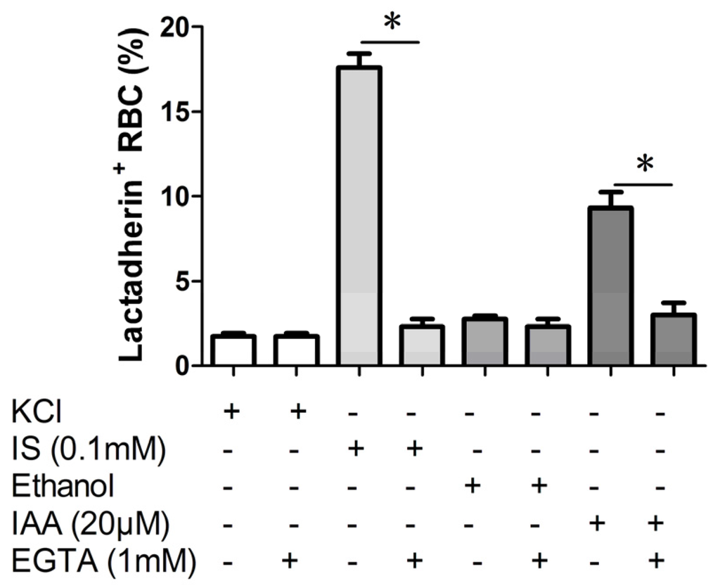 Figure 3. Effect of Ca2+ withdrawal on IS and IAA induced PS exposure. The percentage of lactadherin binding erythrocytes after a 24 h treatment with IS (0.1 mM) or IAA (20 μM) in the presence and absence of EGTA (1 mM). KCl or ethanol was utilized as their respective controls. Data are displayed as mean ± SD for triplicate samples of independent experiments, * indicate p < 0.001.