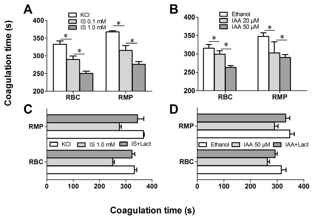 Figure 4. Recalcification time and inhibition assay. RBCs were treated with different concentrations of IS or IAA for 24 h, cells and RMPs were collected, respectively. KCl or ethanol was utilized as their respective controls. Coagulation times of 100 μL RBCs (1 × 108) and RMPs (prepared from 10 mL of the RBCs supernatants) in each group of IS (A) and IAA (B) are shown. PCA of RBCs and RMPs that incubated in IS (C) and IAA (D) were detected in the absence or presence of 128 nM lactadherin. Data are displayed as mean ± SD for triplicate samples of independent experiments, * indicate p < 0.001.