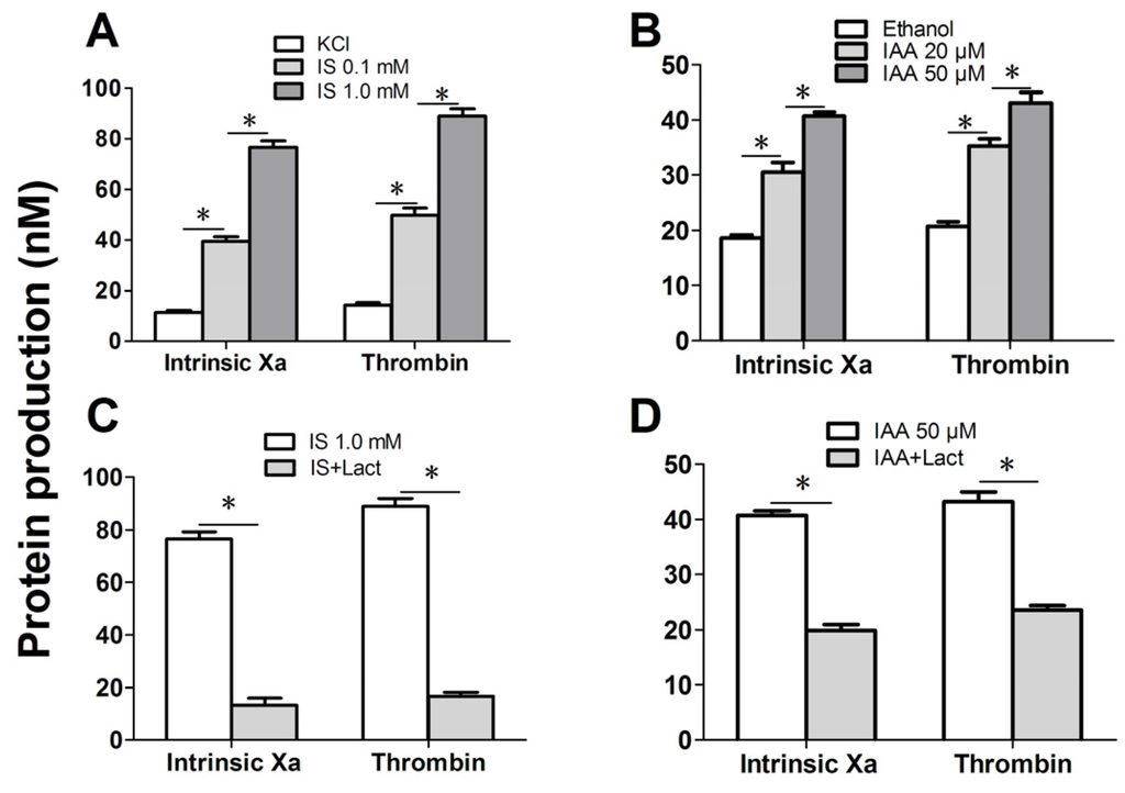 Figure 5. Formation and inhibition assays of procoagulant enzyme complexes. After exposure for 24 h to the different indicated concentration of IS or IAA or KCl (control) or ethanol (control), erythrocytes were washed with Ringer solution. Intrinsic FXa formation was measured in the presence of FIXa, FVIII and thrombin. Thrombin generation was investigated in the presence of FXa and FVa. Intrinsic FXa and thrombin production of 105 RBCs in each group of IS (A) and IAA (B) are shown. The capacity of 128 nM lactadherin to block procoagulant enzyme complexes on RBCs that incubated in IS (C) and IAA (D) was evaluated. Results represent the mean ± SD for triplicate of independent experiments, * indicate p < 0.001.