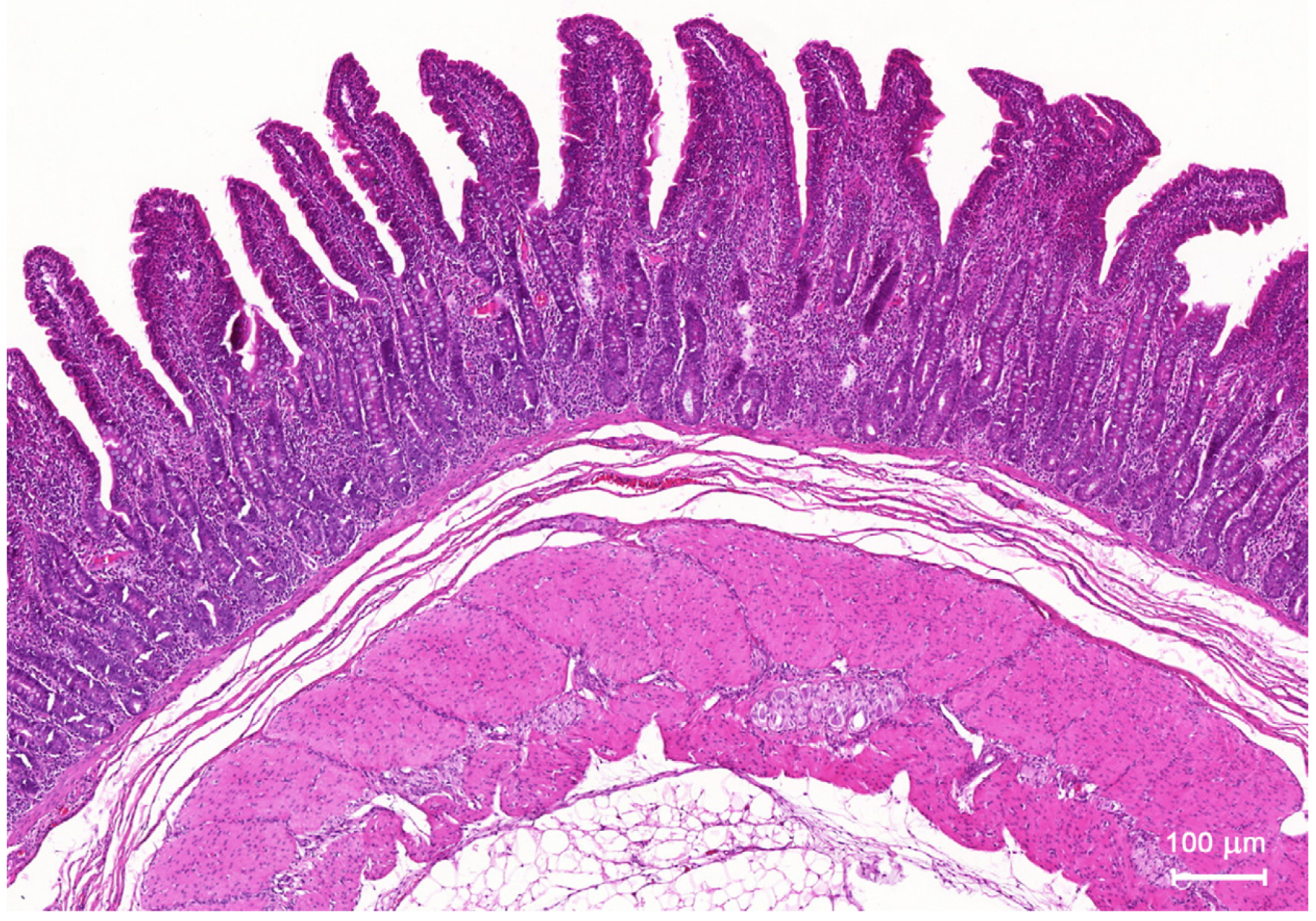 For morphometrical evaluation, the sections were scanned in a Mirax Desk scanner (Carl Zeiss). The following parameters were determined: the thickness of mucosa, the length of villi, the crypt depth, the ratio of villus height to crypt depth, the percentage of goblet cells in epithelium covering villi and forming intestinal glands, the number of lymphocytes per 50 epithelial cells in the villus epithelium, the number of lymphocytes and plasma cells per 10,000 μm2 of the lamina propria. Goblet cells were counted in PAS-stained sections and plasma cells in MPG stained sections. All other measurements were performed in HE-stained sections. The linear measurements were repeated 20 times per animal, the percentages of lymphocytes and goblet cells were determined by counting their number per 50 epithelial cells in 10 randomly selected areas, and the density of lymphocytes and plasma cells in the lamina propria by counting the cells in 10 randomly selected areas of 6000 to 12,000 µm2 each. The measurements were performed using Pannoramic Viewer 1.15 software (3D-Histech, Budapest, Hungary) and AxioVision 4.8 software (Carl Zeiss).