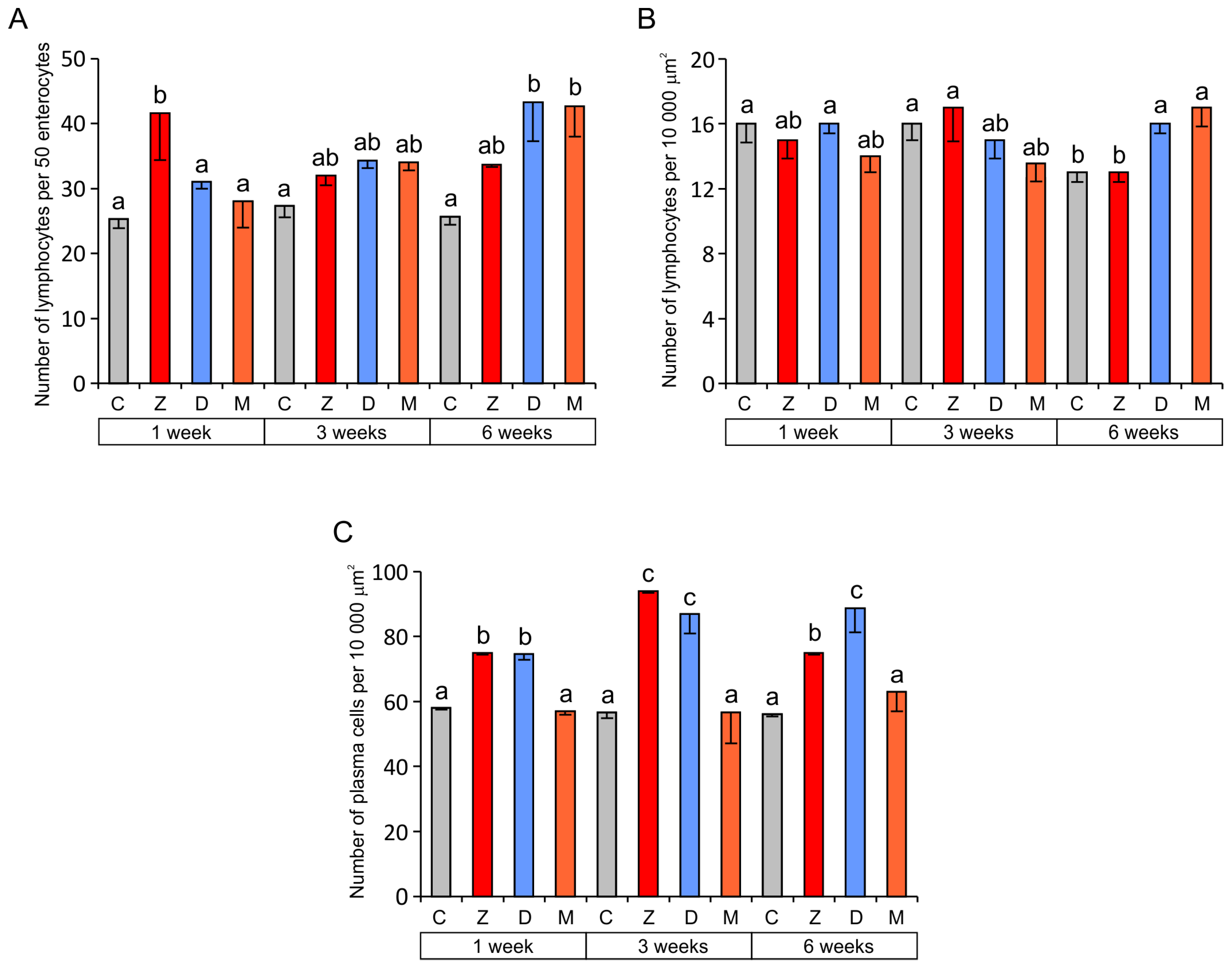 The results of quantitative analyses revealed a significant increase in the relative number of lymphocytes in the epithelium covering villi of the jejunum in group Z after one week and in groups D and M after six weeks of exposure compared to group C (Figure 4A). In the lamina propria, significantly higher counts of lymphocytes were found in groups D and M than in the control group after six weeks of exposure (Figure 4B).