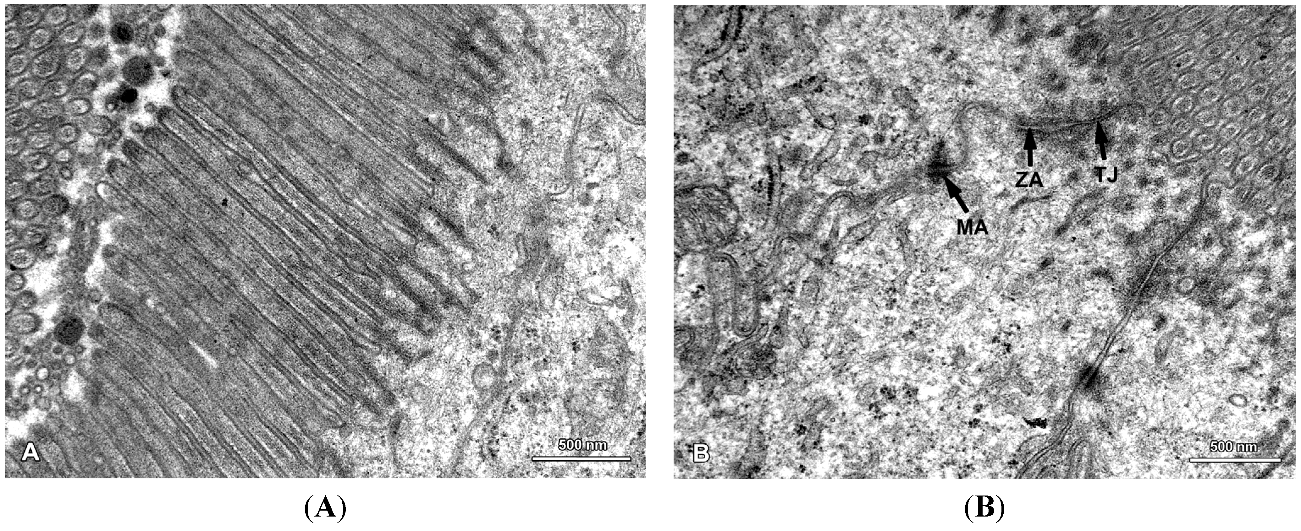 Ultrastructure of the jejunal mucosa epithelium in a pig that received DON for six weeks. (A) Regularly distributed, parallel microvilli on the apical surface of the adsorptive cells; (B) Junctional complexes between the adsorptive cells: TJ, tight junction; ZA, zonula adherens (belt desmosome); MA, macula adherens (spot desmosome).