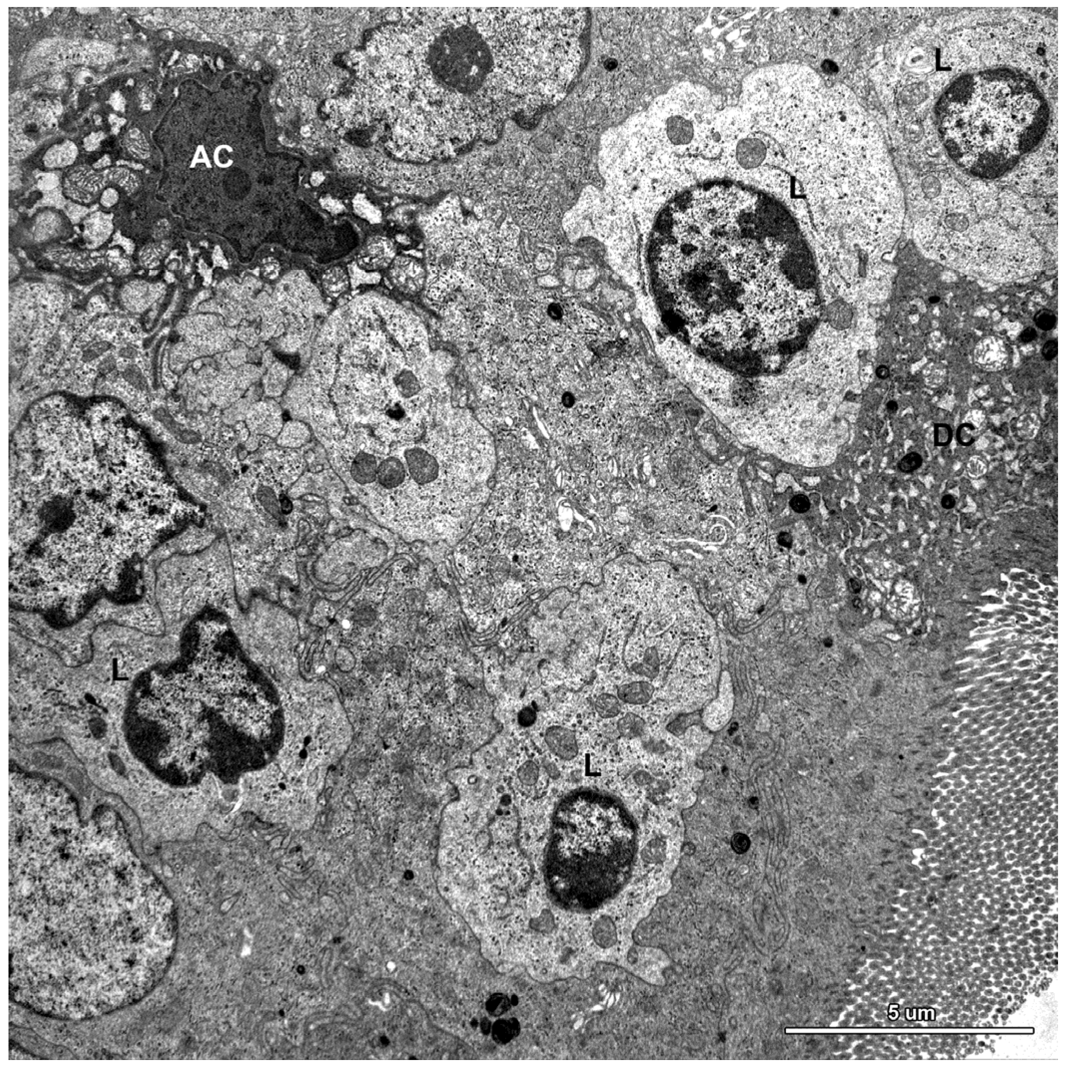 Ultrastructure of the jejunal mucosa epithelium in a pig that received DON for six weeks. Note numerous lymphocytes (L) between epithelial cells, degenerating adsorptive enterocytes (DC), and apoptotic cells (AC).