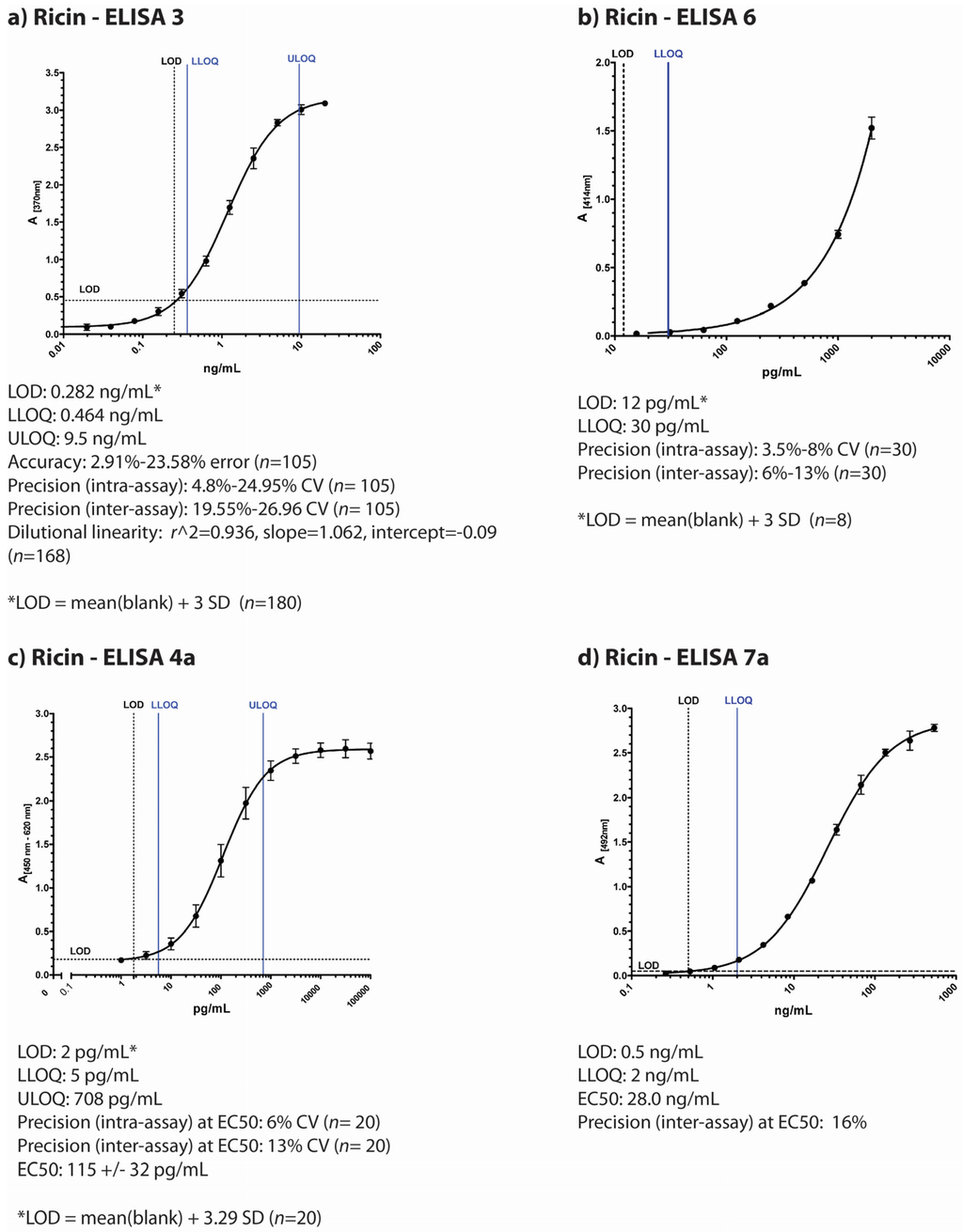 Overview of individual participant laboratory validation studies for different ELISAs detecting ricin and/or RCA120 (a) to (d) display typical standard curves of four different ELISA used in the ricin PT by four participating institutions based on different antibodies as described in the Experimental Section; (e) and (f) display standard curves of two ELISA developed for RCA120 detection. The absorption is plotted against concentration of the lectin. Indicated below the pictures are results of the individual validation studies performed by the four institutions prior to the ricin PT. LOD = limit of detection; ULOQ = upper limit of detection; LLOQ = lower limit of detection; SD = standard deviation; n = sample size.