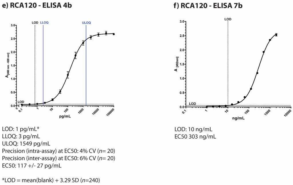 The RCA120-specific ELISA gave similar results in a validation study: The EC50 value was determined at 117 ± 27 pg/mL, the LOD at 1 pg/mL. The working range of the RCA120-specific ELISA lay between the lower limit of quantification of 3 pg/mL and the upper limit of quantification of 1549 pg/mL. Intra-assay and inter-assay coefficient of variations were determined at 4% and 6% at the EC50 value, respectively (n = 20).