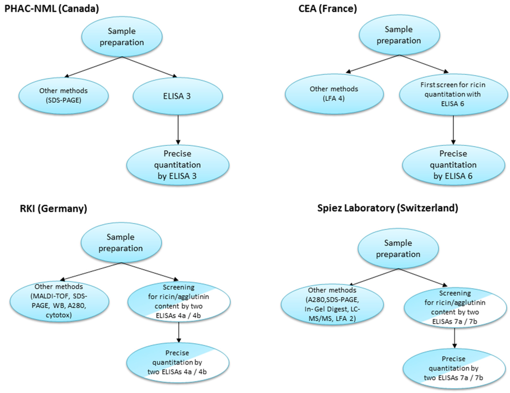 For CEA laboratory (ELISA 6), the first screening was realized using sandwich ELISA. Each sample was measured in a log dilution from undiluted to 1:103 dilution in a double determination (use of 450 µL of each sample). In-house purified ricin has been used as standards to determine concentrations of the toxins in the samples. Based on the results obtained in the first screening samples S2, S6, S7 and S9 were retested by sandwich-ELISA from 1:102 to 1:105 dilutions in order to be in the linear range of the standard curve (use of 10 µL of each sample). All the samples have been tested using specific LFA undiluted or diluted 10 fold for samples S4 and S9 (use of 200 µL of each sample and 250 µL for samples S4 and S9). Overall the maximum volume used to perform all the tests (Sandwich ELISA + LFA) for one sample was 710 µL.
