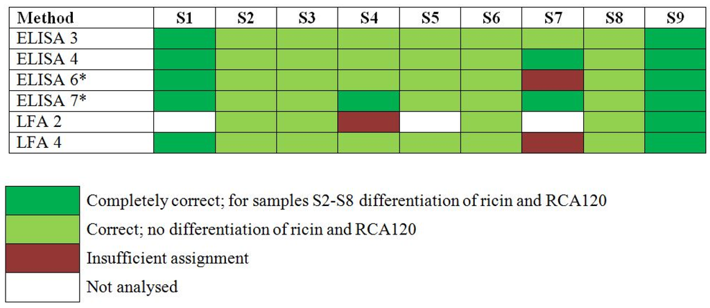 Qualitative results showed that ELISA 6 was correct in identifying 5 of the 6 samples containing ricin (S3, S4, S6, S7, S8, S9). For the sample S7 a misinterpretation of the assays led to an insufficient assignment. Sample S1, a negative control, was correctly found to contain no ricin. The on-site detection assay LFA 4 correctly detected ricin and/or RCA120 in 8 of 9 proficiency panel samples, including sample S6 which had a high concentration of ricin. Only one sample (S7), containing a low concentration of ricin (0.441 ng/mL) yielded an insufficient assignment. In spite of low cross-reaction with RCA120 (0.1%) the LFA was not able to differentiate ricin and large levels of RCA120.