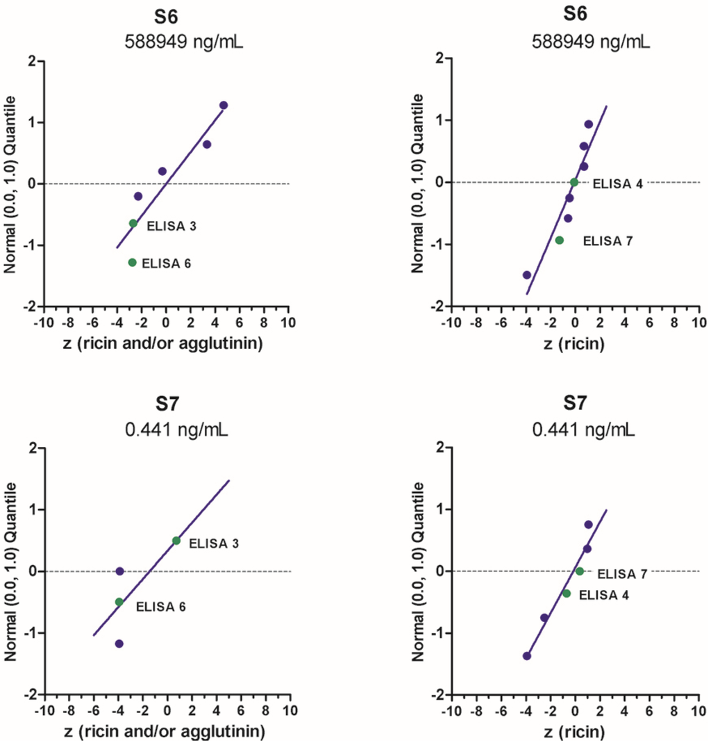 Normal probability plot of z-scores for quantification of “ricin” or “ricin and/or RCA120” in samples S6 and S7. Standard normal quantiles were plotted against the z-scores (for more information please see [32]). The analysis was done by considering all methods used to quantify the indicated samples. Each dot corresponds to one method used by one laboratory, highlighted in green are results presented by the four different ELISA approaches presented in this manuscript.