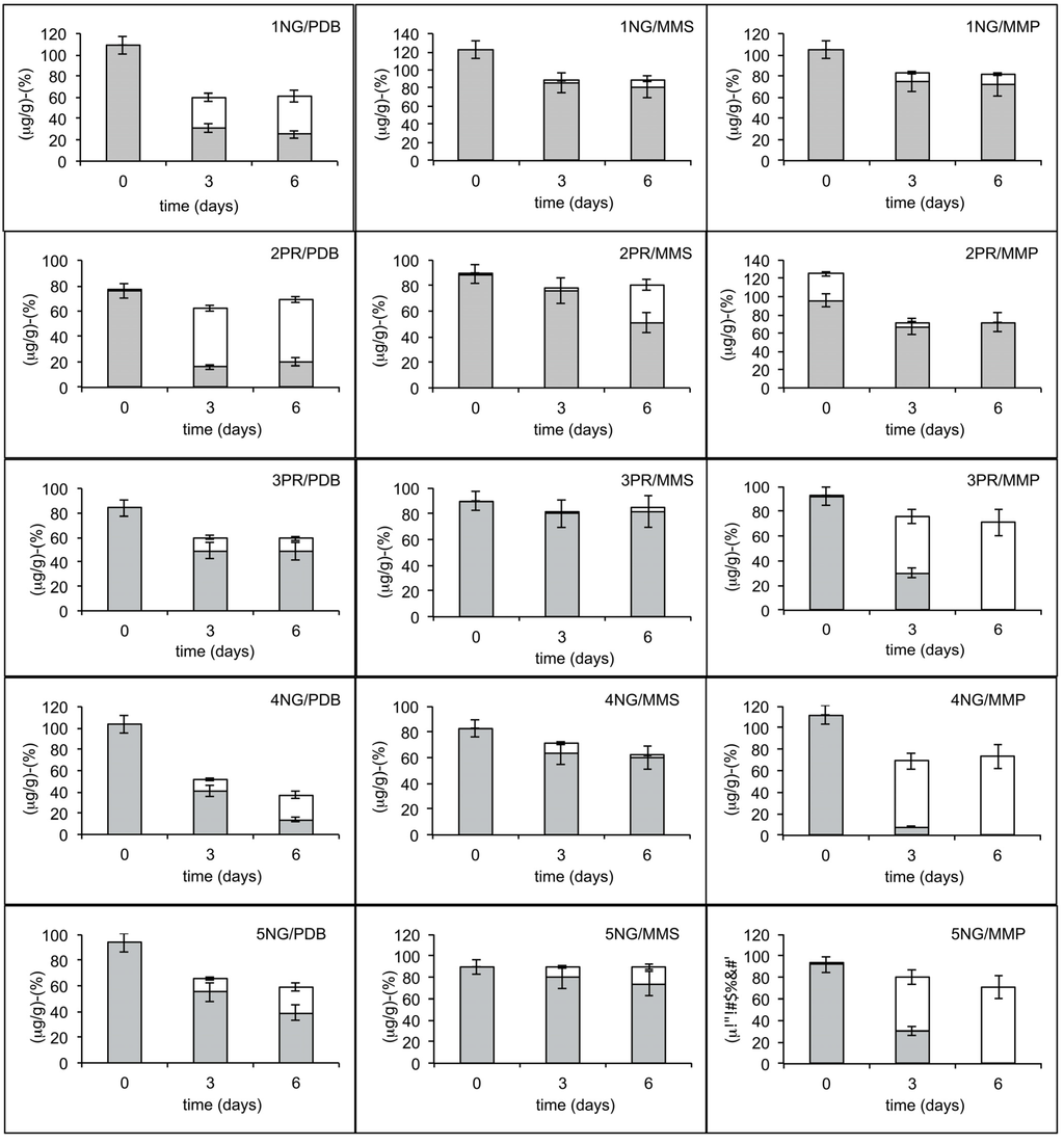 The three different liquid substrates used to support the growth of the microorganisms were: minimal medium (MM = K2HPO4 (2.5 g/L), KH2PO4 (2.5 g/L), (NH4)2HPO4 (1.0 g/L), MgSO4·7H2O (0.2 g/L), FeSO4 (0.01 g/L), MnSO4·7H2O (0.007 g/L)) with Bacto Peptone (0.5%, w/v) (MMP), minimal medium with sucrose (1.0%, w/v) (MMS), and potato dextrose broth (PDB) (Oxoid, Basingstoke UK) [35]. OTA (Sigma-Aldrich, St Louis, Missouri, USA) was added to MMP, MMS, and PDB media at a final concentration of 10 µg/mL. When the mycotoxin was used as the sole carbon source, it was added to MM medium at a final concentration of 100 µg/mL. Cultures were incubated at 24 °C with continuous shaking (180 rpm) and aliquots (0.5 mL) from each culture were collected after 0, 72, and 144 h. Cells were harvested by centrifugation (10,000× g for 10 min at 4 °C), the supernatants were filter sterilized (0.2 µm, Millipore, Billerica, MA, USA) and used for chemical analyses [60]. Each sample was tested in triplicate.