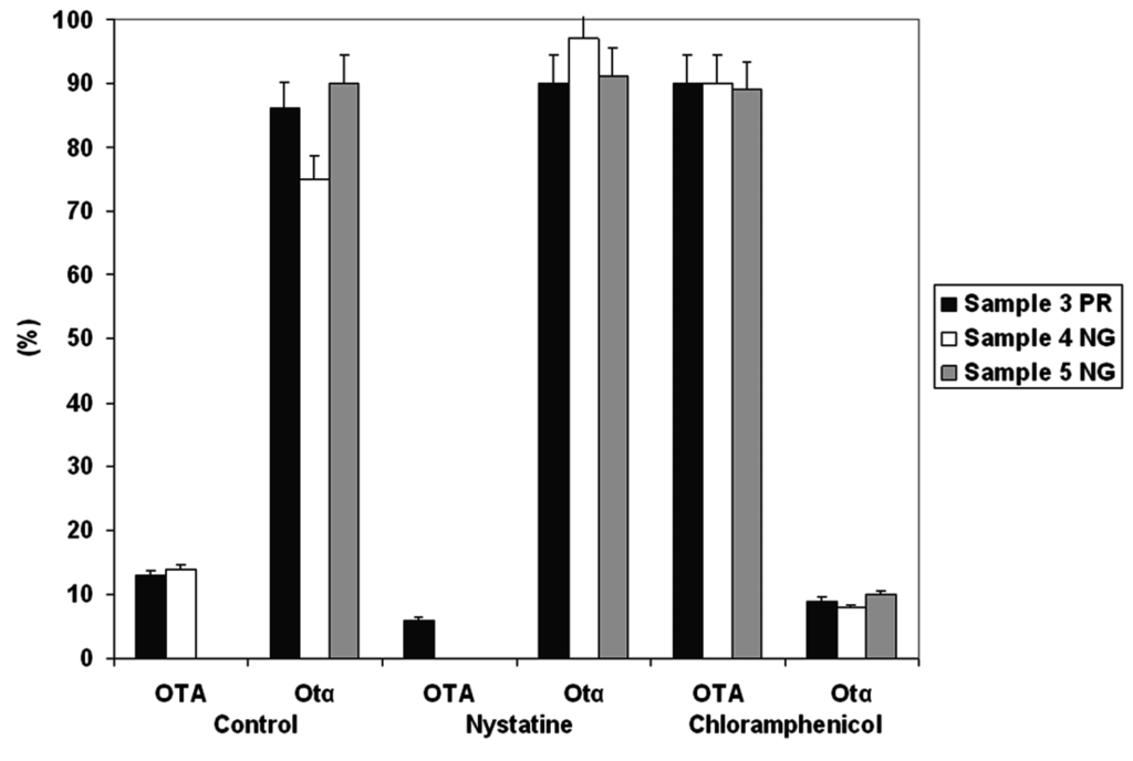 Ochratoxin A degradation by microbial populations associated with the three soil samples respectively cultured in presence of nystatine or chloramphenicol. The OTA degradation in absence of antibiotic addition is also shown.