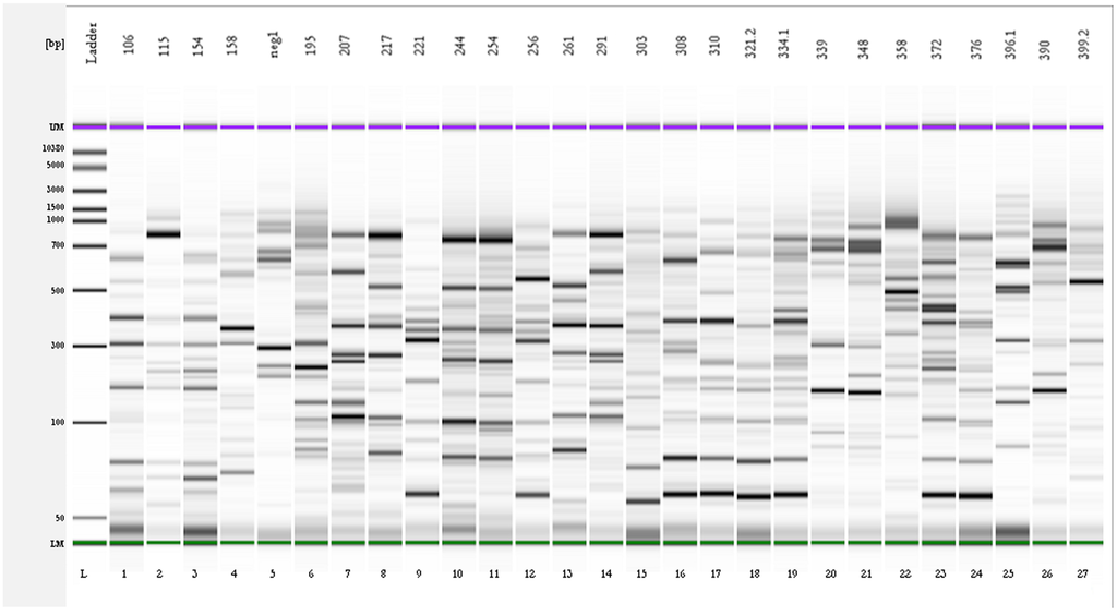 Gel-like image obtained using the Agilent Expert software of the 27 different rep-PCR profiles identified after the analysis of the 225 OTA-degrading isolates. The profiles were obtained using primers REP-1R-Dt/REP-2R-Dt. L: DNA 7500 ladder.