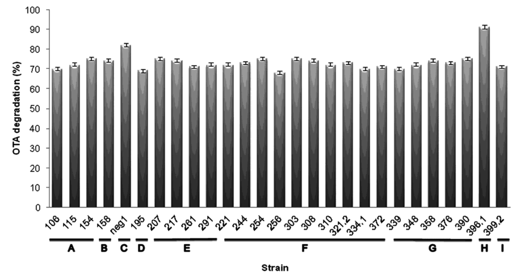 Percentage of OTA degradation by the twenty-seven strains identified by the REP-PCR analysis. Cultures were incubated at 24 °C and mycotoxin degradation was evaluated by HPLC-FLD assay after six days. Bars represent standard errors. (A) Pseudomonas taiwanensis; (B) Leclercia adecarboxylata; (C) Acinetobacter sp. neg1; (D) Pantoea agglomerans; (E) Pseudomonas reinekei; (F) Pseudomonas koreensis; (G) Enterobacter aerogenes; (H) Acinetobacter calcoaceticus; and (I) Enterobacter xiangfangensis.