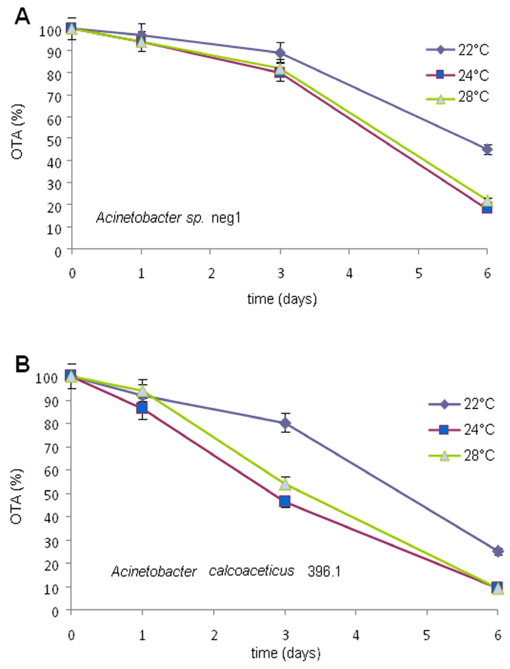 OTA degradation by Acinetobacter sp. neg1 (A) and A. calcoaceticus 396.1; and (B) in MMP medium added with 1 µg/mL of OTA. Cultures were incubated at 22, 24 and 28 °C and mycotoxin degradation was evaluated by HPLC-FLD assay at 13 and six days post inoculation.