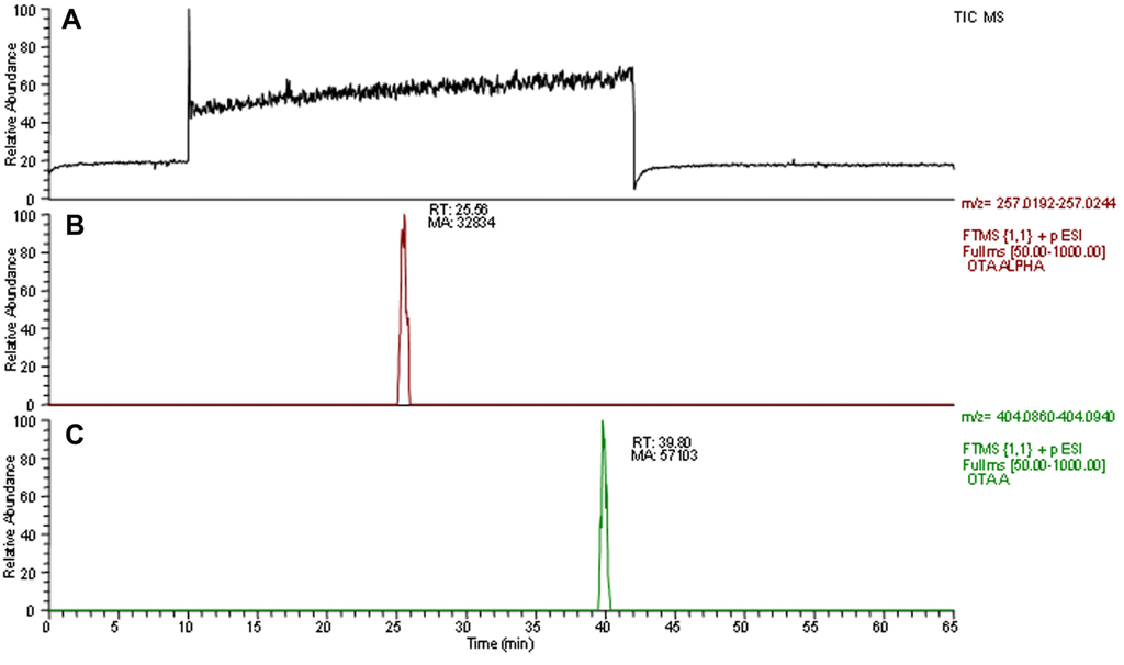 LC-HR-MS Total Ion Current (TIC) and extracted ion chromatograms (XIC) filtered on the accurate mass of ochratoxin A and ochratoxin alpha from the supernatant of liquid culture sample added with ochratoxin A and inoculated Acinetobacter sp. neg1. In the upper panels are reported (A) the full mass chromatogram; (B) the extracted ion chromatogram filtered on the accurate mass of ochratoxin alpha; and (C) the extracted ion chromatogram filtered on the accurate mass of ochratoxin A.
