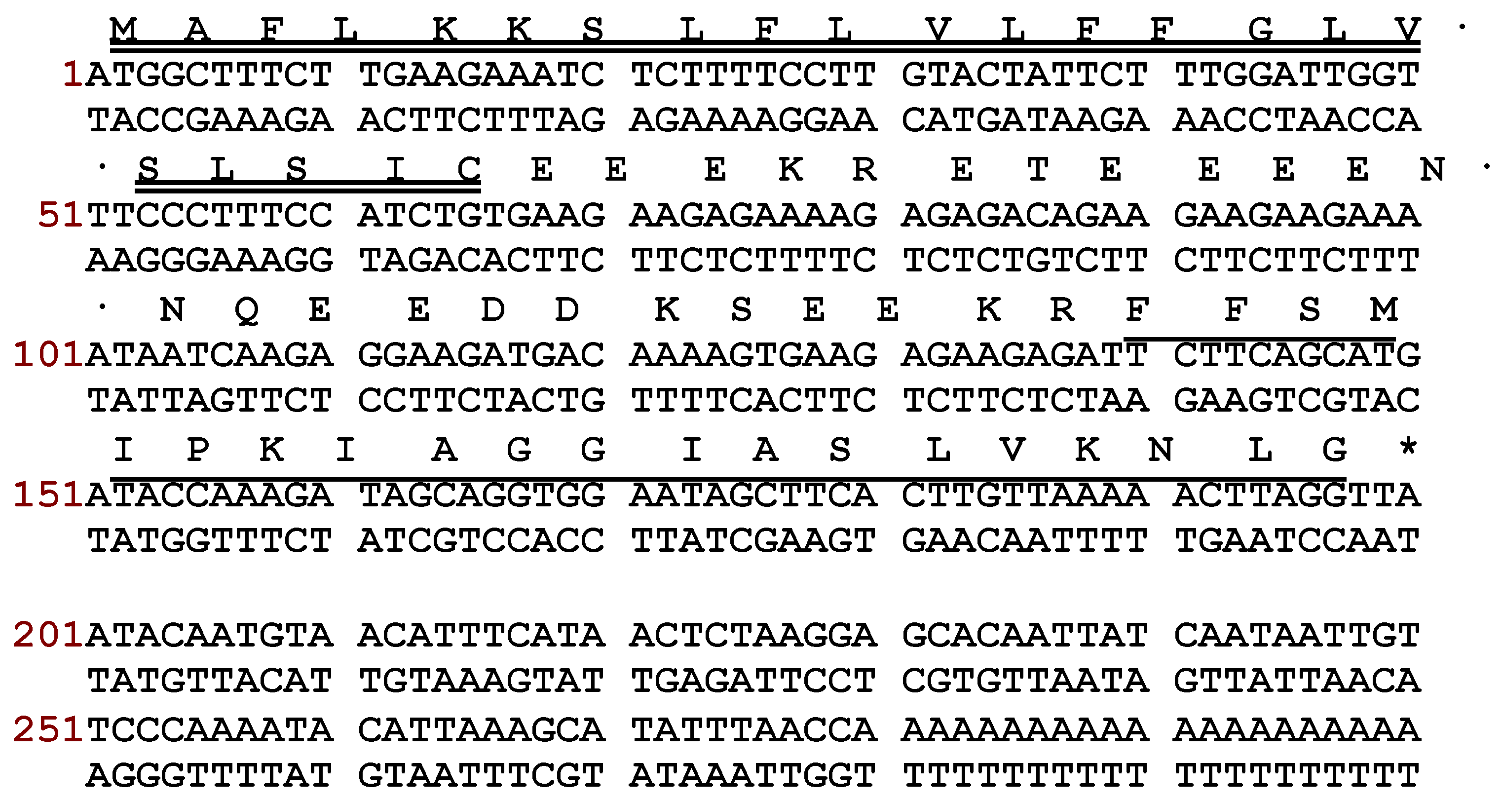 Nucleotide and translated open-reading frame amino acid sequences of cloned cDNA encoding the biosynthetic precursor of Phylloseptin-PBa. Double underlining indicates the putative signal peptide sequence, single underlining indicates the mature peptide sequence and an asterisk indicates the stop codon.
