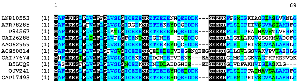 Using a Phyllomedusinae-specific degenerate primer, designed to the highly conserved signal region from previously sequenced peptides from phyllomedusine frogs, a full-length cDNA encoding Phylloseptin-PBa was successfully and repeatedly cloned (at least 25 clones were represented) from the skin secretion-derived cDNA library of Phyllomedusa baltea. Through bioinformatic searches, the putative mature peptide was analysed using the NCBI BLASTp program, which demonstrated that Phylloseptin-PBa was a new member of the phylloseptin family. The nucleotide and translated open reading frame amino acid sequences of precursor-encoding cDNA are shown in Figure 1. Essentially, there were several defining characteristics of note: (1) the open reading frame of the precursor consisted of 66 amino acid residues, which containing the mature peptide of 19 amino acids; (2) A highly- conserved putative signal peptide region of 21 amino acid residues; (3) An acidic amino acid residue-rich “spacer” peptide containing 22 residues; (4) A classical propeptide convertase processing site (-KR-); (5) A mature active peptide encoding domain that contained 19 amino acid residues with a typical phylloseptin N-terminal; (6) A C-terminal G residue that acts as an amide donor for the L residue that terminates the mature peptide. According to the results of BLAST analyses, Phylloseptin-PBa showed a high level of structural homology to phylloseptins from other frogs of the sub-family, Phyllomedusinae, including PS-7 to PS-11 from Phyllomedusa hypochondrialis, PS-7, 8, 12 and 15 from Phyllomedusa azurea, PS-1 from Phyllomedusa sauvagei and PS-B from Phyllomedusa bicolor [3]. The alignment of amino acid sequences of the precursor isolated from Phyllomedusa baltea with the top hits found in the database, are shown in Figure 2. The nucleotide sequence of the Phylloseptin-PBa precursor has been deposited in the European Molecular Biology Laboratory (EMBL) Nucleotide Sequence Database under the accession code LN810553.