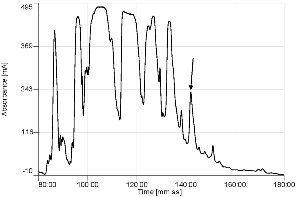 Region of reverse phase HPLC chromatogram of Phyllomedusa baltea skin secretion showing the absorbance peak (arrow) corresponding to Phylloseptin-PBa. The Y-axis shows the relative absorbance in milli-absorbance units at 214 nm and the X-axis shows the retention time.