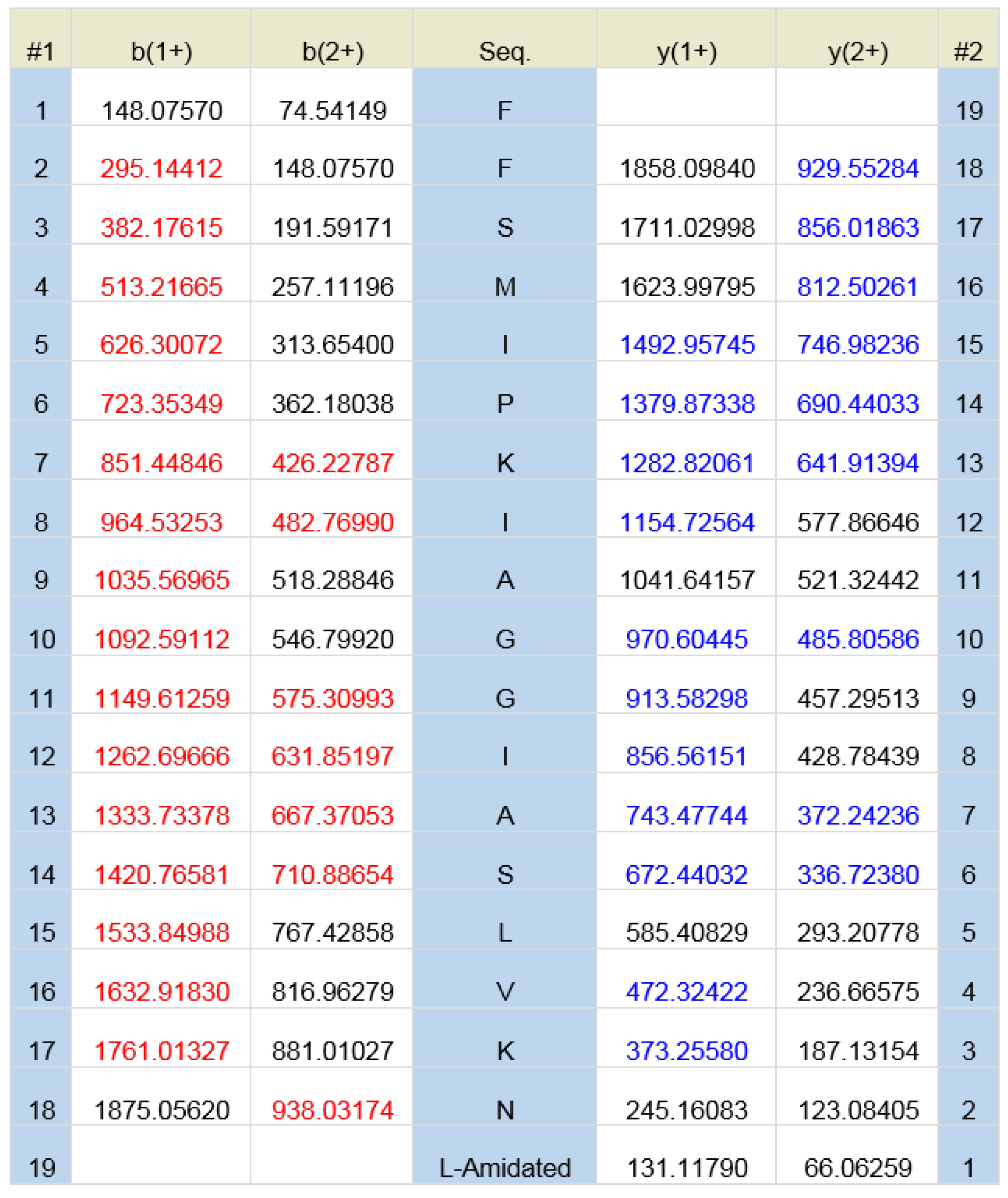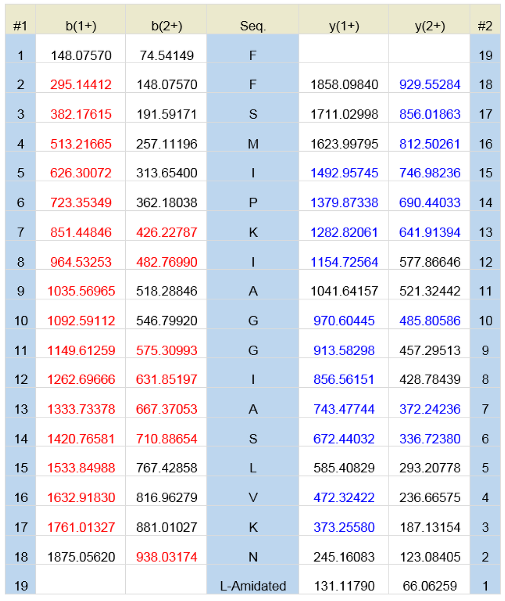 Predicted singly- and doubly-charged y-ions and b-ions arising from MS/MS fragmentation of Phylloseptin-PBa. Actual fragment ions observed following MS/MS fragmentation are indicated in blue and red.