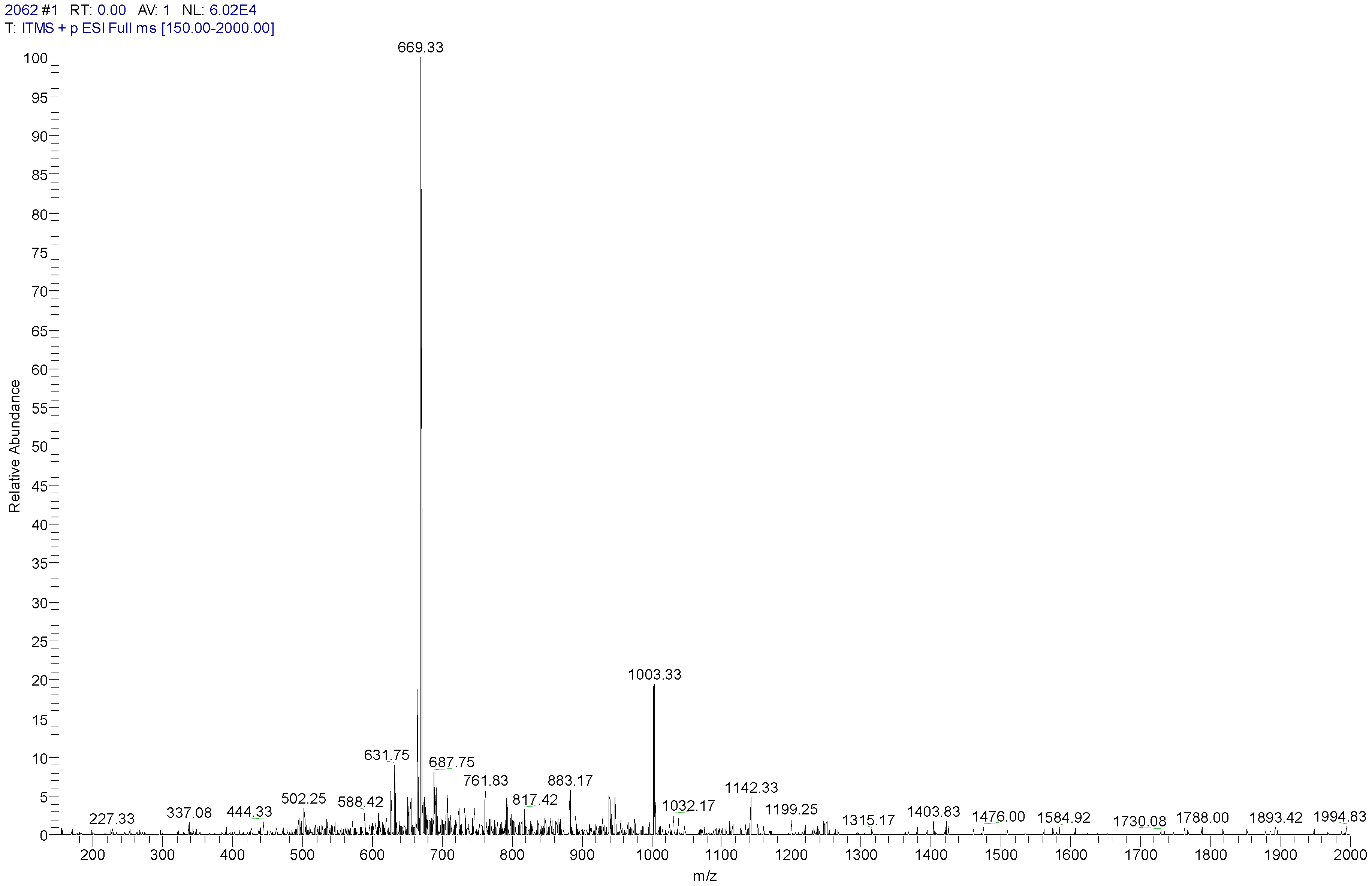 The MS full scan of synthetic phylloseptin-PBa obtained from the LCQ Fleet electrospray ion-trap mass spectrometer. The ions of m/z 669.33 and 1003.33 were triply charged and doubly charged, respectively.