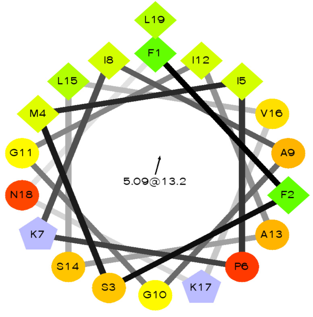 Helical wheel plot of Phylloseptin-PBa. An amphipathic character was observed with side chains of the hydrophobic residues (M4, L15, I8, F1, L19 I12, I5, V16, A9) partitioning to one side of the molecule and the cationic amino acid groups (α-amino of G10, side-chain groups of amino acids K7 and K17) appearing on the opposite side.