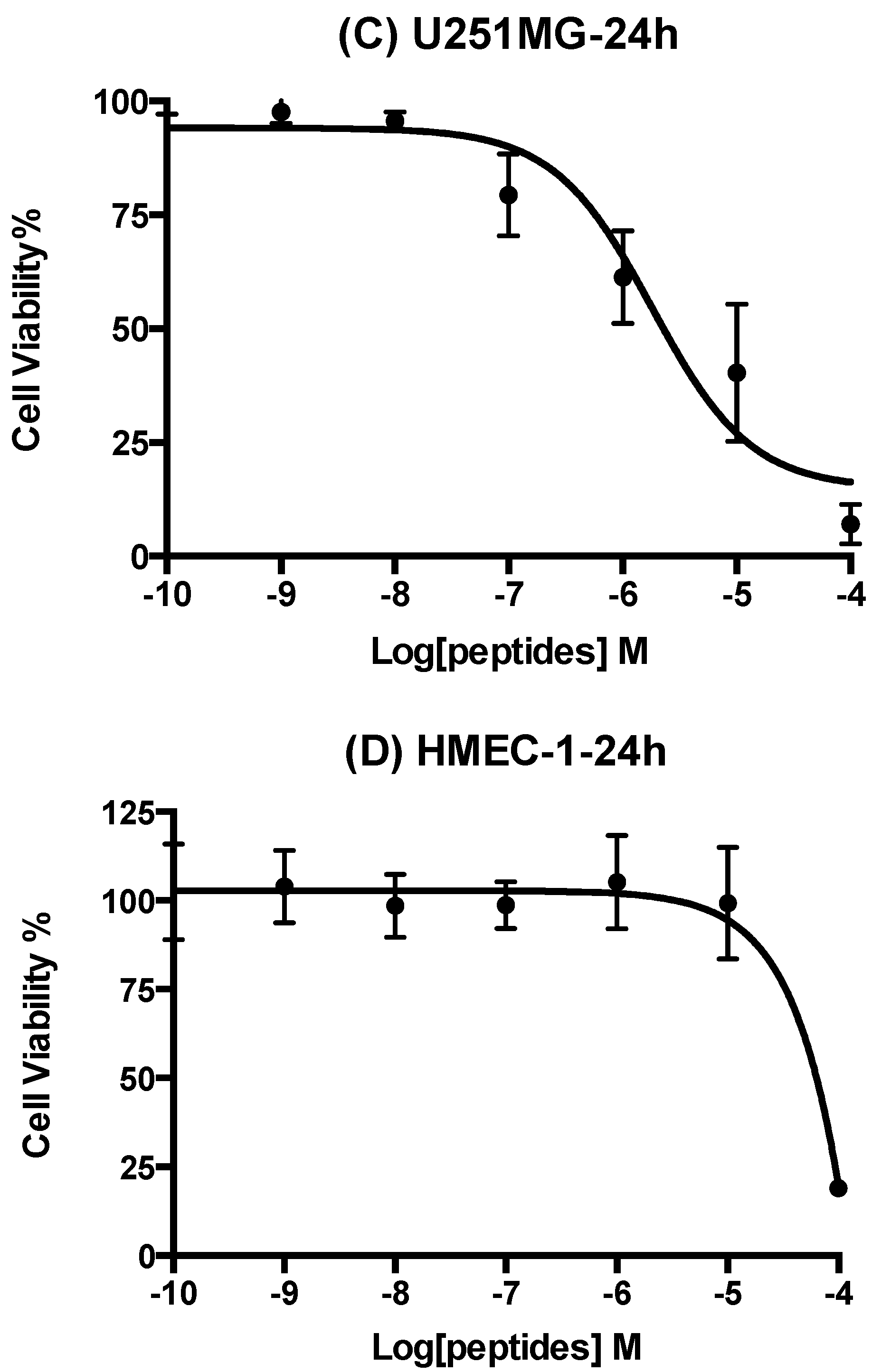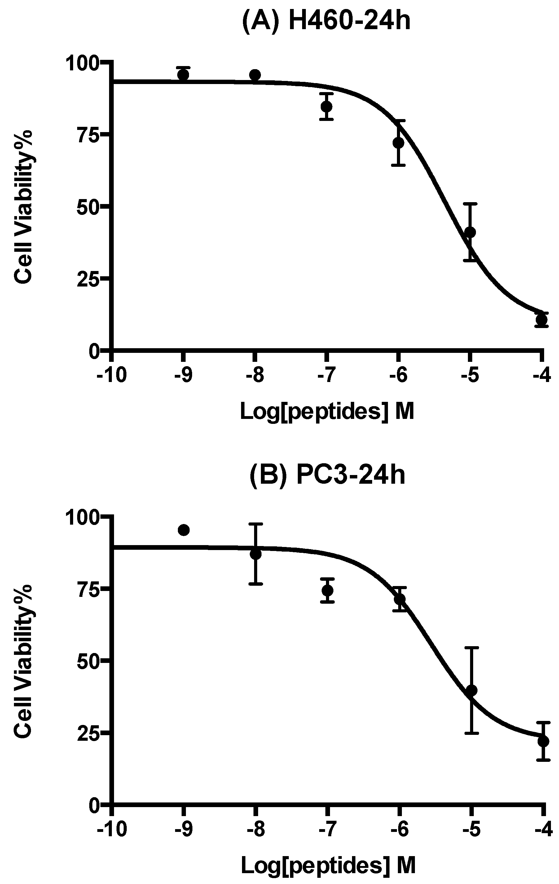 Dose-response curves of Phylloseptin-PBa on human cancer cell lines after a 24 h incubation. Panels A, B, C and D show the peptide effects on H460 (lung cancer), PC3 (prostate cancer), U251MG (neurospongioma), and HMEC-1 (microvessel endothelial cells). IC50 values were 4.3 µM, 2.9 µM, 1.8 µM and 36.6 µM, respectively.