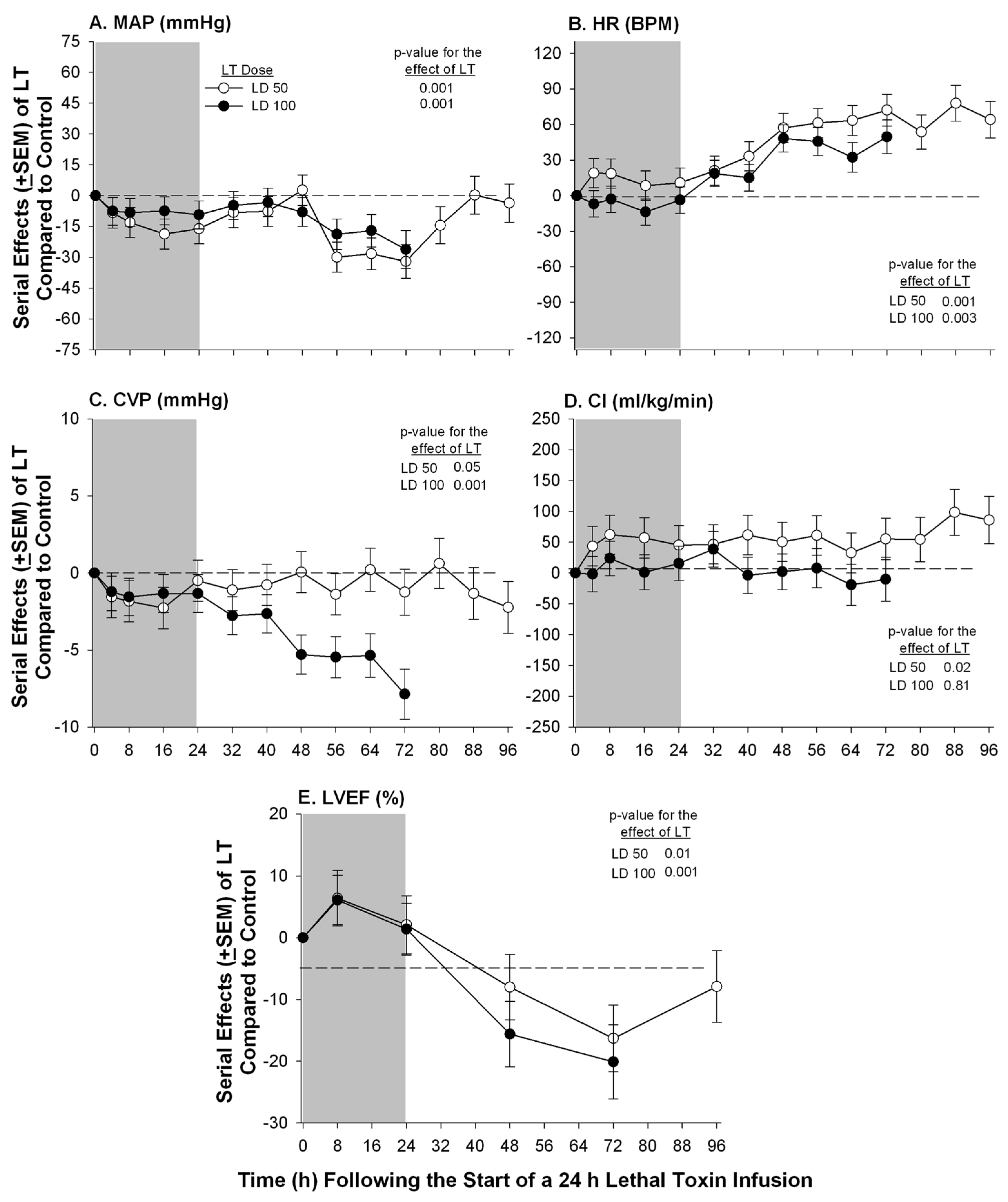 Serial mean effects (± SEMs) of 24 h infusions (shaded areas) of low (LD50) or high (LD100) doses of lethal toxin (LT) compared to protective antigen alone (controls) on changes from baseline in mean arterial pressure (MAP, panel A), heart rate (HR, panel B), central venous pressure (CVP, panel C), cardiac index (CI, panel D) and left ventricular ejection fraction (LVEF, panel E). The p-values shown are for the effects of LT compared to control. Increases or decreases with LT (compared to controls) are indicated by symbols above or below the dashed horizontal no-effect line respectively.
