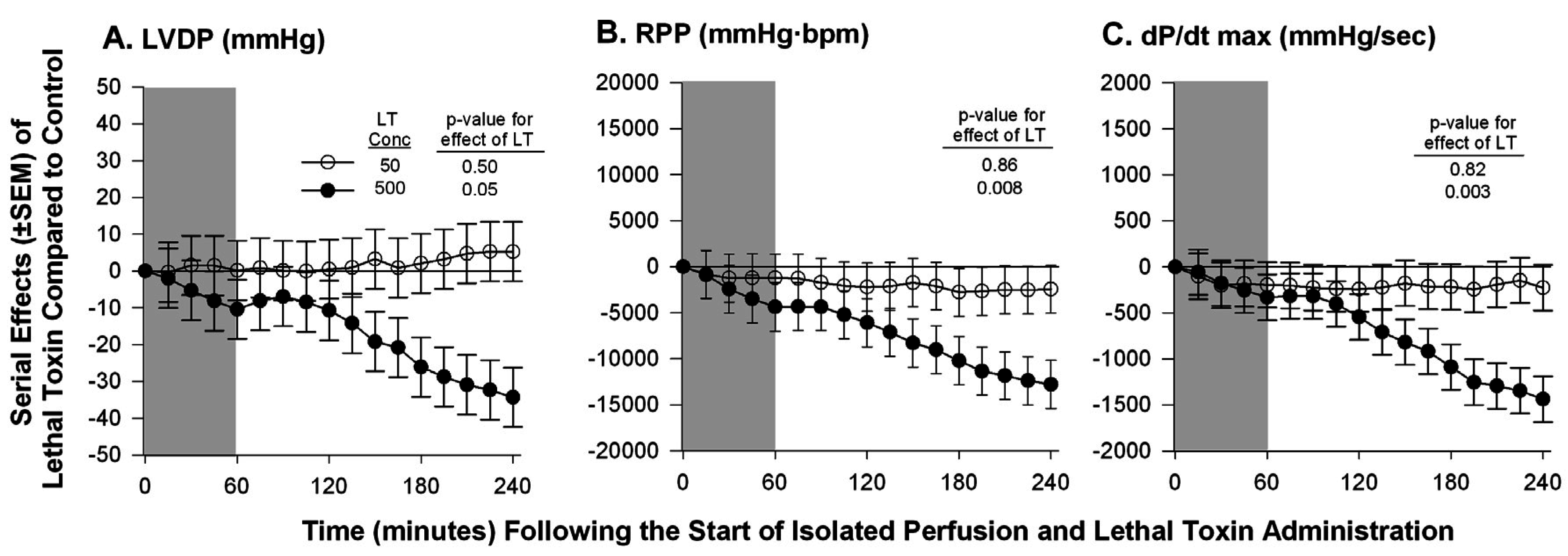 Serial mean effects (± SEMs) of two concentrations of lethal toxin (LT, 50 or 500 ng/mL) compared with protective antigen alone (controls) administered to isolated perfused hearts excised from healthy animals on left ventricular developed pressure (LVDP, panel A), rate pressure product (RPP, panel B) and rate of change in LV pressure during contraction (dP/dt max, panel C). The shaded area represents the time of LT or control administration. The p-values shown are for the effect of LT versus control. Increases or decreases with LT (compared to controls) are indicated by symbols above or below the dashed horizontal no-effect line respectively. The LT concentration of 50 ng/mL was comparable to a dose previously shown to produce a 50% lethality rate in in vivo experiments. Although the concentration of 500 ng/mL did depress myocardial function, this represented a dose 10-fold greater than one producing lethality in vivo.