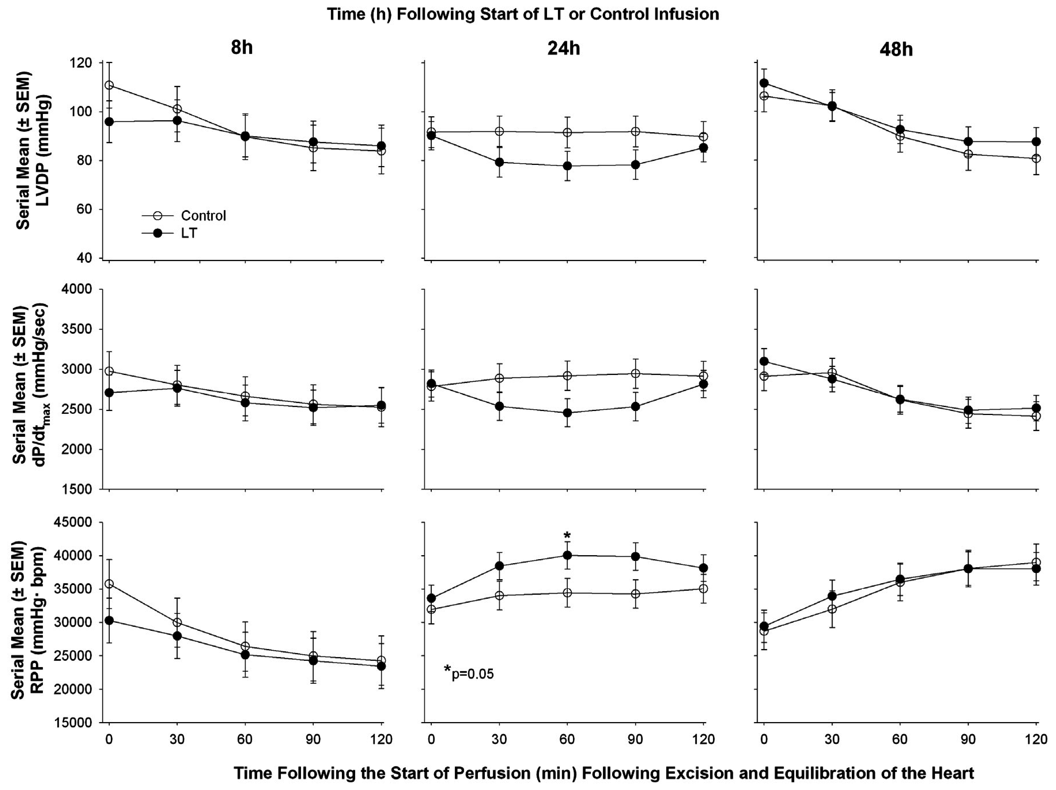 Serial mean (±SEM) left ventricular developed pressure (LVDP), maximum rate of change in LV pressure during contraction (dP/dt max), and rate pressure product (RPP) in hearts excised from animals at either 8, 24, or 48 h after the initiation of an in vivo 24 h infusion of lethal toxin (LT) or protective antigen alone (control) and then perfused under constant pressure. The only significant difference (p = 0.05) that was noted between LT and control was a decrease in dP/dt max at 60 min of perfusion.