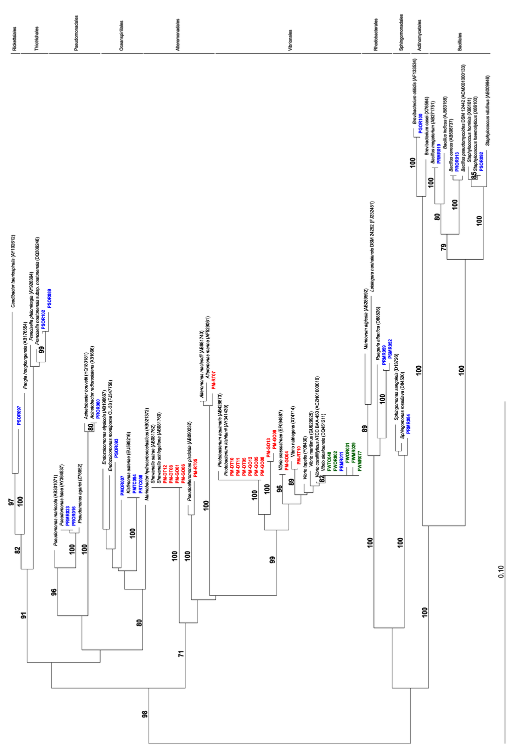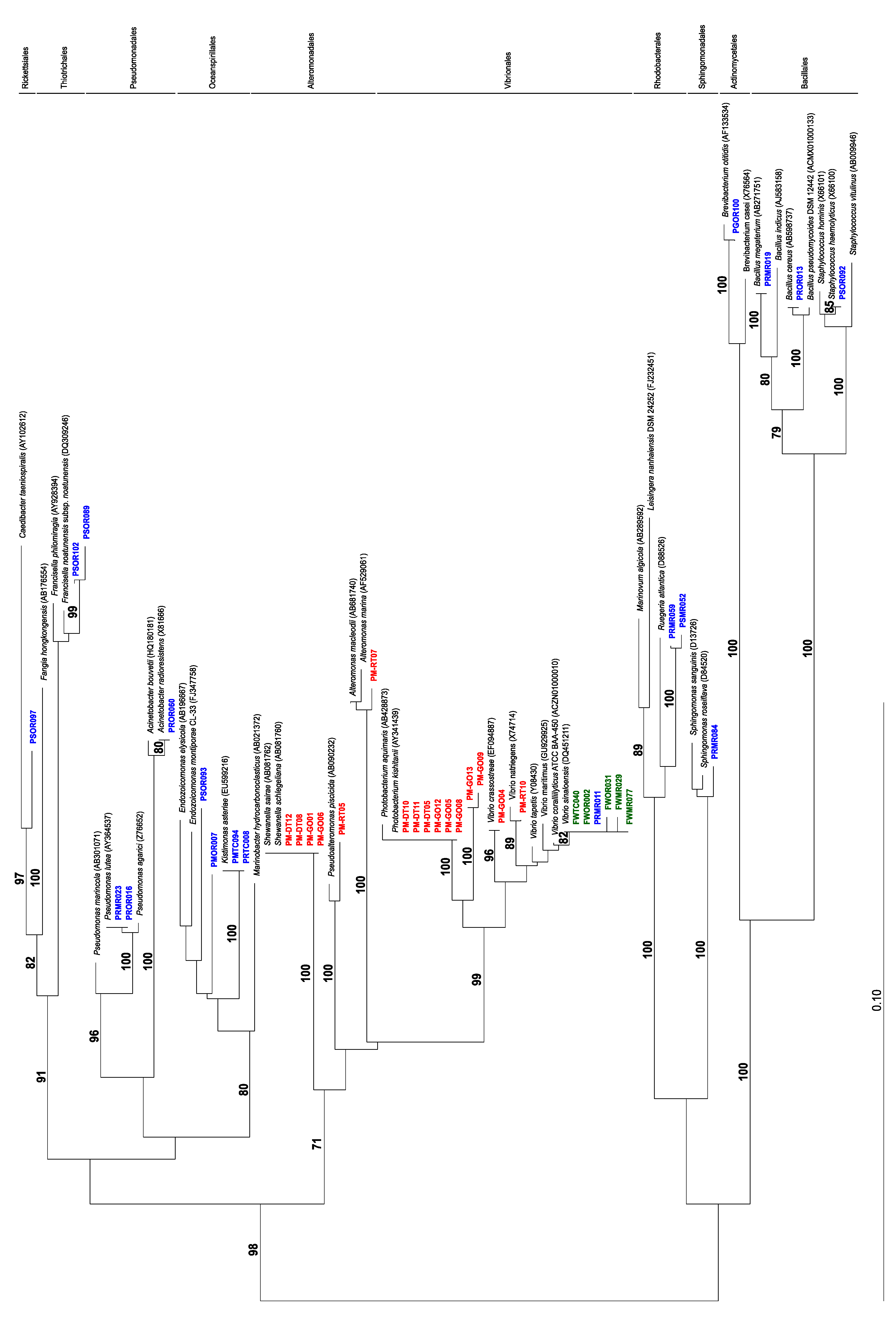 Neighbor-joining phylogenetic tree of 16S rRNA gene sequences of isolates from this study and related bacteria. Isolates from different organisms are color coded as follows: green = Stylochoplana sp., blue = Pleurobranchaea maculata (this study), red = P. maculata [44]. (Bootstrap values < 70 are omitted).